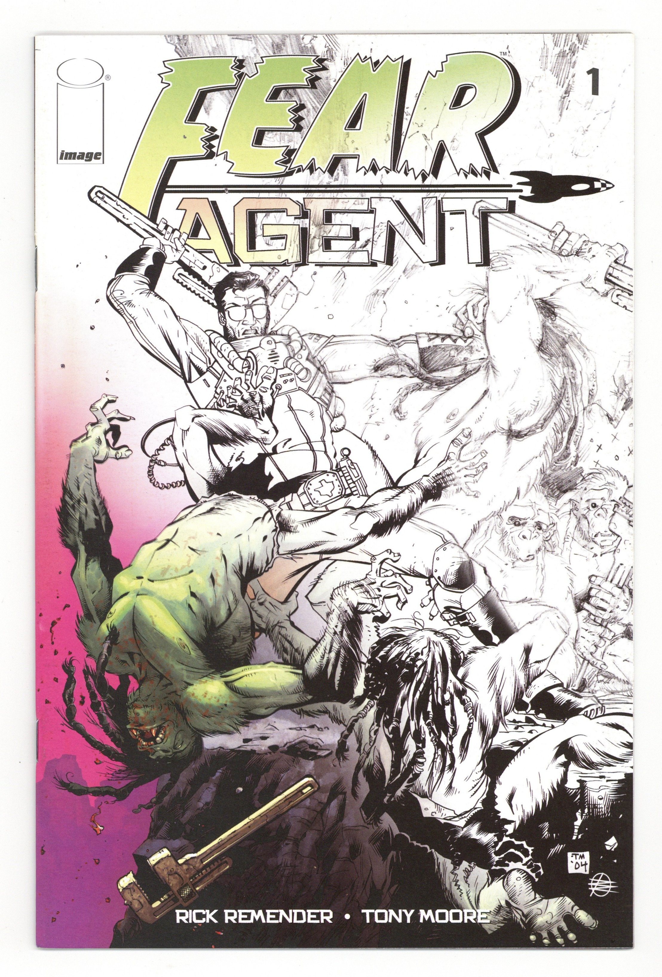 Published Oct 2005 by Dark Horse.$45.00RRP Retailer Summit Cover. Written by Rick Remender, Art by Tony Moore and Sean Parsons, Cover by Tony Moore and Rick Remender. The Fear Agents are no more. Once known throughout the universe for driving three invading alien races from Earth, they stood as a testament to the strength of the human spirit. Now, Heath Huston drunkenly scuttles across the galaxy as an alien exterminator, the last of their ranks. Combining the aesthetic elements of all three of the genres that made EC comics the high water mark of sequential storytelling (science fiction, war, and horror) Heath's adventures take readers on monthly jaunts to brave new worlds overrun by jellyfish brains, wild ape-men and rickety robots bent on intergalactic domination! 28 Pages, Full Color. Cover price $2.99.