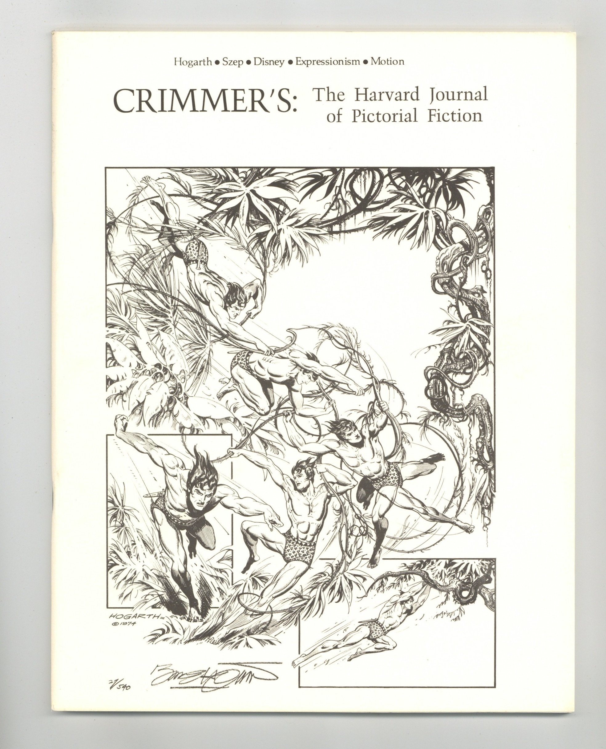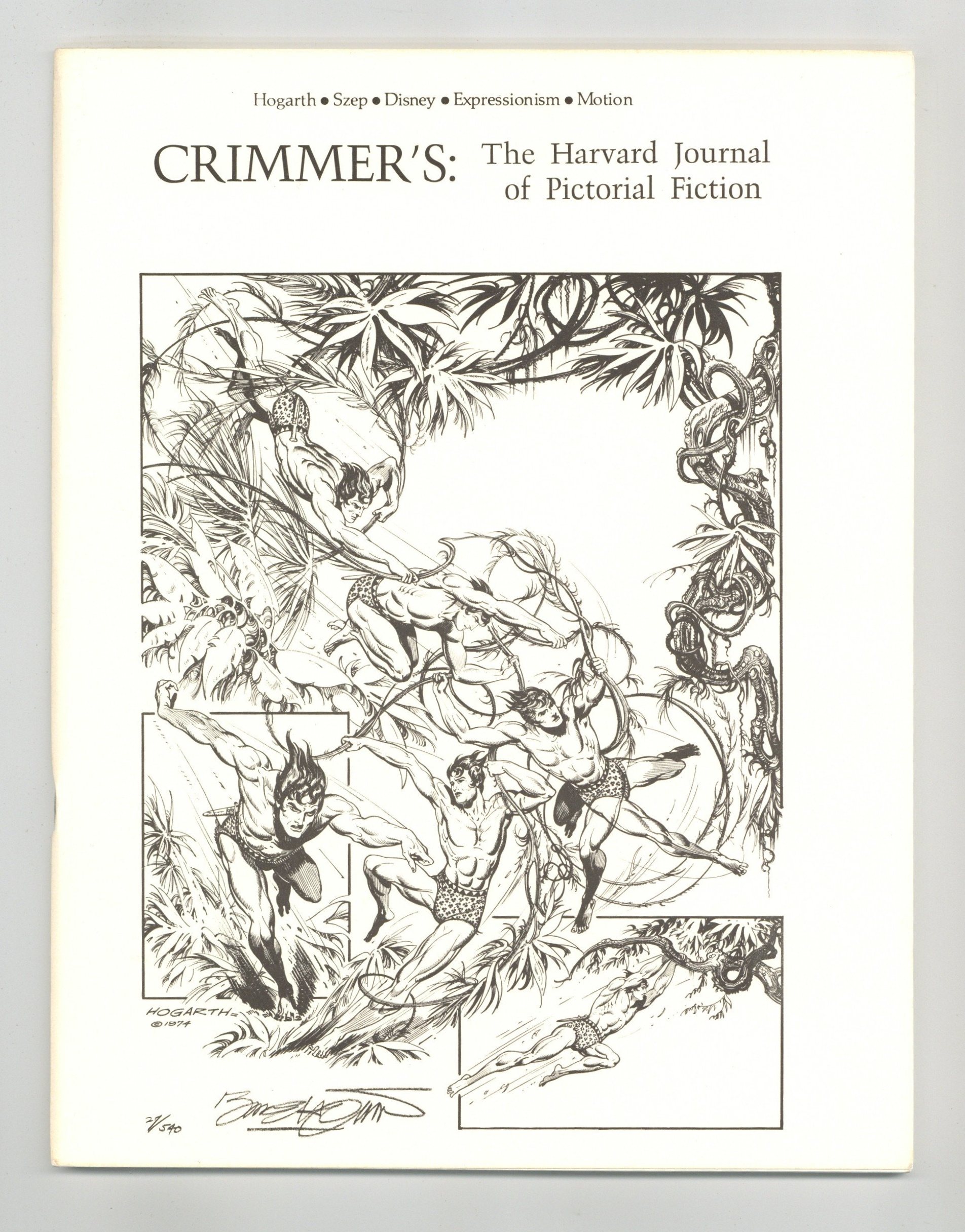 Winter, 1975. A journal of the narrative arts. Editor: T.A. Durwood. Advisor: Gil Kane. Tarzan cover by Burne Hogarth. "Interview with Paul Szep" - The Boston Globe editorial cartoonist and 1974 Pulitzer Prize winner talks about caricature, American humor, other artists, and, of course, politics. "The Image in Motion" by T.W. King - A look at the 20th Century's fascination with movement and its depiction -- in comics, film, and television. "Interview with Burne Hogarth" - The brilliant illustrator of Tarzan and one of the most prominent figures in the history of narrative art delves into the nature of the art form, the direction of his own career, Surrealism, and the question of unconscious content in art. "On Hogarth" by M. Wilson-Cline - An understanding of the artistic influences that contribute to the Hogarth style, with specific comparisons to the Renaissance, neo-classicists, Mannerists, and German Expressionists. "Two Disney Artists" - Senior Disney artists John Hench and Marc Davis give their acute insights into the remarkable achievements of the Disney Studios. "Expressionism in Film" by S. Gersor - How and how successfully were the principles of Expressionism incorporated into live-action film? 60 pages, B&W.