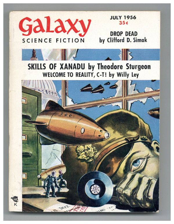 Published Jul 1956 by Galaxy Publications.$10.00July 1956. Cover by Jack Coggins. Stories: "Drop Dead" by Clifford D. Simak, "Bad Medicine" by Finn O'Donnevan, "The Skills of Xanadu" by Theodore Sturgeon, "Gypped" by Lloyd Biggle, Jr., "Writing of the Rat" by James Blish, "All The Things You Are" by Robert Sheckley, "Horror Howce" by Margaret St. Clair. Softcover Pulp Digest, 5-in. x 7-in.; 160 Pages, B&W. Cover price $0.35.