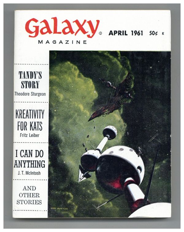 Published Apr 1961 by Galaxy Publications.$9.00April 1961. Cover by Hunter. Stories: "Planeteer" by Fred Saberhagen, "I Can Do Anything" by J.T. McIntosh, "Tandy's Story" by Theodore Sturgeon, "Kreativity For Kats" by Fritz Leiber, "Scent Makes A Difference" by James Stamers, "Homey Atmosphere" by Daniel F. Galouye, "All The People" by R.A. Lafferty, and "The Feeling" by Roger Dee. Softcover Pulp Digest, 5-in. x 7-in.; 194 Pages, B&W. Cover price $0.50.