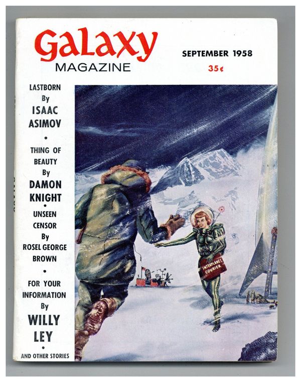 Published Sep 1958 by Galaxy Publications.$12.75September 1958. Cover by Dember. Stories: "Lastborn" by Isaac Asimov, "From An Unseen Censor" by Rosel George Brown, "Thing of Beauty" by Damon Knight, "On The Double" by Lloyd Biggle, Jr., "The Stroke of the Sun" by Arthur C. Clarke, "Personnel Problem" by H.L. Gold. Softcover Pulp Digest, 5-in. x 7-in.; 144 Pages, B&W. Cover price $0.35.