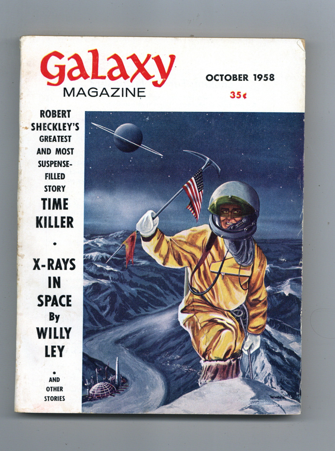 Published Oct 1958 by Galaxy Publications.$19.00October 1958. Cover by Sol Dember. Stories: "Time Killer" (Part 1 of 4) by Robert Sheckley, "The Wizards of Pung's Corners" by Frederik Pohl, "Lisbon Cubed" by William Tenn, "Paramount ULJ" by Avram Davidson, "Block That Metaphor" by Robert Bloch. Softcover Pulp Digest, 5-in. x 7-in.; 144 Pages, B&W. Cover price $0.35.