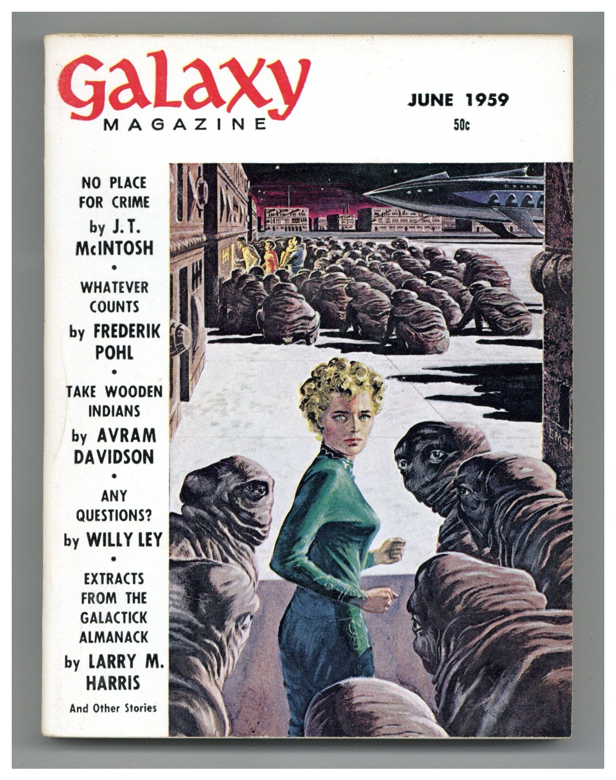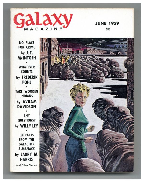 Published Jun 1959 by Galaxy Publications.$6.20June 1959. Cover by Ed Emshwiller (Emsh). Stories: "Whatever Counts" by Frederik Pohl, "Take Wooden Indians" by Avram Davidson, "No Place For Crime" by J.T. McIntosh, "Traveling Companion Wanted" by Richard Wilson, and "Soft Touch" by Daniel F. Galouye. Non-Fact Article: "Extracts From The Galactick Almanack - Music Around the Universe" by Larry M. Harris. Illustrations by Wallace Wood, Dillon, Don Martin, & Dick Francis. Softcover Pulp Digest, 5-in. x 7-in.; 144 Pages, B&W. Cover price $0.50.