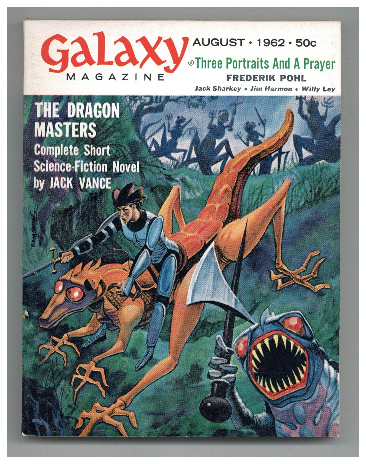Published Aug 1962 by Galaxy Publications.$10.00August 1962. Cover by jack Gaughan. Stories: "The Dragon Masters" by Jack Vance, "One Race Show" by John Jakes, "Handyman" by Frank Banta, "A Matter of Protocol" by Jack Sharkey, "Three Portraits and a Prayer" by Frederik Pohl, "Always A Qurono" by Jim Harmon. Article: "The Luck of Magnitudes" by George O. Smith. Illustrations by Jack Gaughan, George Schelling, and Bob Ritter. Softcover Pulp Digest, 5-in. x 7-in.; 194 Pages, B&W. Cover price $0.50.