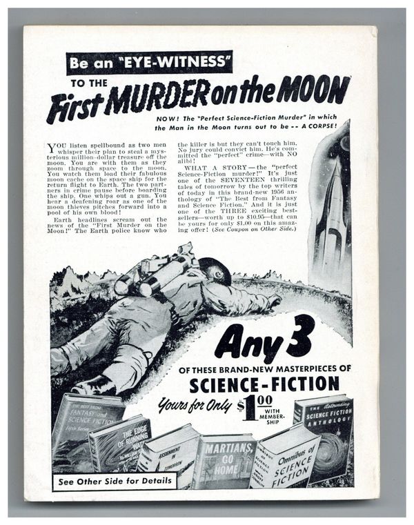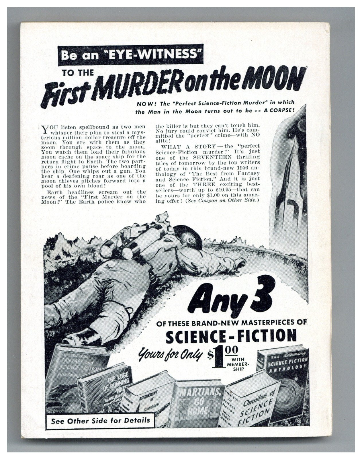 Published Nov 1956 by Galaxy Publications.$10.50November 1956. Cover by Ed Emshwiller (Emsh). Stories: "The Man Who Ate The World" by Frederik Pohl, "Dead Ringer" by Lester del Rey, "Vigil" by E.C. Tubb, "Double Dare" by Robert Silverberg, "The Stars My Destination" (Part 2 of 4) by Alfred Bester. Illustrations by Irv Docktor, Dick Francis, Virgil Finlay, and Emsh. Softcover Pulp Digest, 5-in. x 7-in.;144 Pages, B&W. Cover price $0.35.