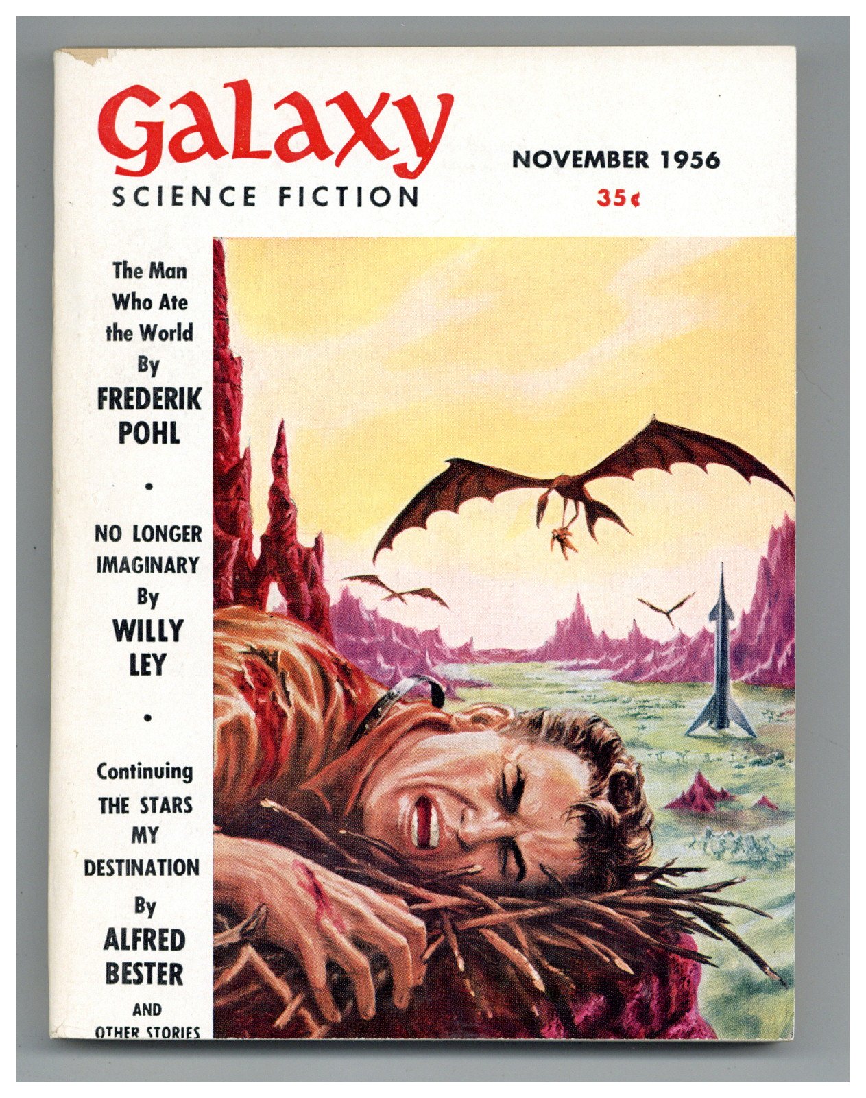 Published Nov 1956 by Galaxy Publications.$15.50November 1956. Cover by Ed Emshwiller (Emsh). Stories: "The Man Who Ate The World" by Frederik Pohl, "Dead Ringer" by Lester del Rey, "Vigil" by E.C. Tubb, "Double Dare" by Robert Silverberg, "The Stars My Destination" (Part 2 of 4) by Alfred Bester. Illustrations by Irv Docktor, Dick Francis, Virgil Finlay, and Emsh. Softcover Pulp Digest, 5-in. x 7-in.;144 Pages, B&W. Cover price $0.35.
