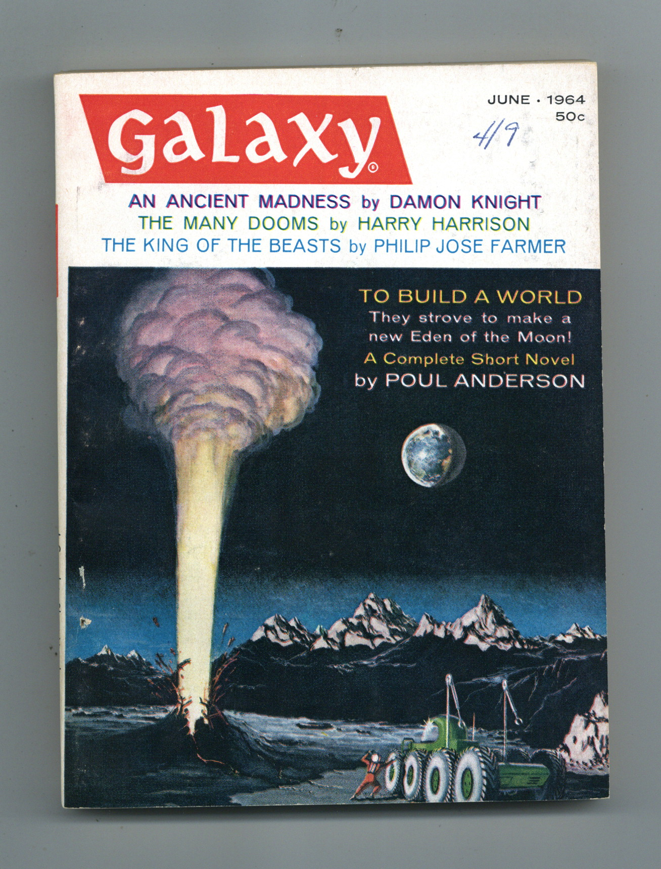 Published Jun 1964 by Galaxy Publications.$15.75June 1964. Cover by McKenna. Stories: "To Build a World" by Poul Anderson, "The Well-Trained Heroes" by Arthur Sellings, "An Ancient Madness" by Damon Knight, "The Sincerest Form" by J.W. Groves, "The King of the Beasts" by Philip Jose Farmer, "The Man From Earth" by Gordon R. Dickson, "Collector's Fever" by Roger Zelazny, "The Many Dooms" by Harry Harrison, and "Men of Good Will" by Ben Bova and Myron R. Lewis. Illustrations by Gray Morrow, John Giunta, Jack Gaughan, Norman Nodel, and Cowles. Softcover Pulp Digest, 5-in. x 7-in.;194 Pages, B&W. Cover price $0.50.