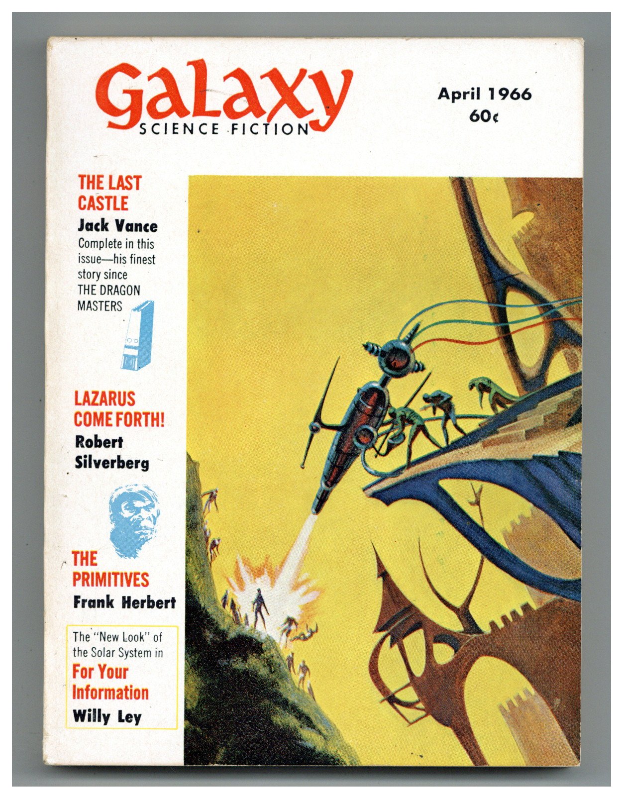 Published Apr 1966 by Galaxy Publications.$8.49April 1966. Cover by Jack Gaughan. Stories: "The Last Castle" by Jack Vance, "Lazarus Come Forth!" by Robert Silverberg, "The Primitives" by Frank Herbert, "The Crystal Prison" by Fritz Leiber, "The Night Before" by George Henry Smith, "Big Business" by Jim Harmon, and "Devise and Conquer" by Christopher Anvil. Non-Fact Article: Twenty-Seven Inches of Moonshine" by Jack B. Lawson. Illustrations by Jack Gaughan, Gray Morrow, and Wallace Wood. Softcover Pulp Digest, 5-in. x 7-in.;194 Pages, B&W. Cover price $0.50.