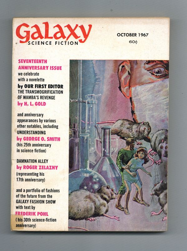 October 1967. Cover by Gray Morrow. Stories: "Damnation Alley" by Roger Zelazny, "The Transmogrification of Wamba's Revenge" by H.L. Gold, and "Understanding" by George O. Smith. Non-Fact Article: "Poulfinch's Mythology" by Poul Anderson. Special Feature: "A Galaxy of Fashion" by Frederik Pohl. Illustrations by Jack Gaughan, Virgil Finlay, Gray Morrow, R. Dorfman, and Carol Pohl. Softcover Pulp Digest, 5-in. x 7-in.;194 Pages, B&W. Cover price $0.50.