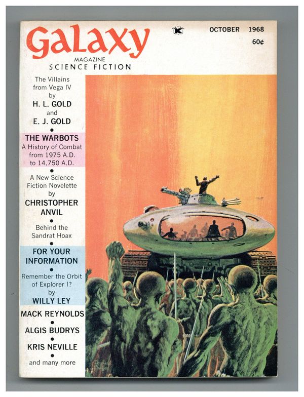 Published Oct 1968 by Galaxy Publications.$10.00October 1968. Cover by Douglas Chaffee. Stories: "The Villains From Vega IV" by H.I. Gold and E.J. Gold, "Thyre Planet" by Kris Neville, "Criminal In Utopia" by Mack Reynolds, "I Bring You Hands" by Colin Kapp, "Behind The Sandrat Hoax" by Christopher Anvil, "All They Myriad Ways" by Larry Niven, "Homespinner" by Jack Wodhams, "A Visit To Cleveland General" by Sydney Van Scyoc. Non-Fact Article: "The Warbots" by Larry S. Todd. Illustrations by Jack Gaughan, Dan Adkins, Joe Wehrle Jr., Brand, Virgil Finlay, Todd, and Safrani. Softcover Pulp Digest, 5-in. x 7-in.;194 Pages, B&W. Cover price $0.60.