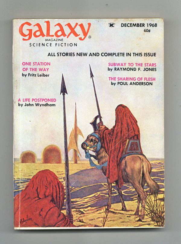 Published Dec 1968 by Galaxy Publications.$5.00December 1968. Cover by John Pederson. Stories: "The Sharing of Flesh" by Poul Anderson, "Subway To The Stars" by Raymond F. Jones, "A Life Postponed" by John Wyndham, "Spying Season" by Mack Reynolds, "One Station of the Way" by Fritz Leiber, "Sweet Dreams, Melissa" by Stephen Goldin, "Jinn" by Joseph Green. Illustrations by Reese, Jack Gaughan, Gray Morrow, and Roger Brand. Softcover Pulp Digest, 5-in. x 7-in.;194 Pages, B&W. Cover price $0.60.