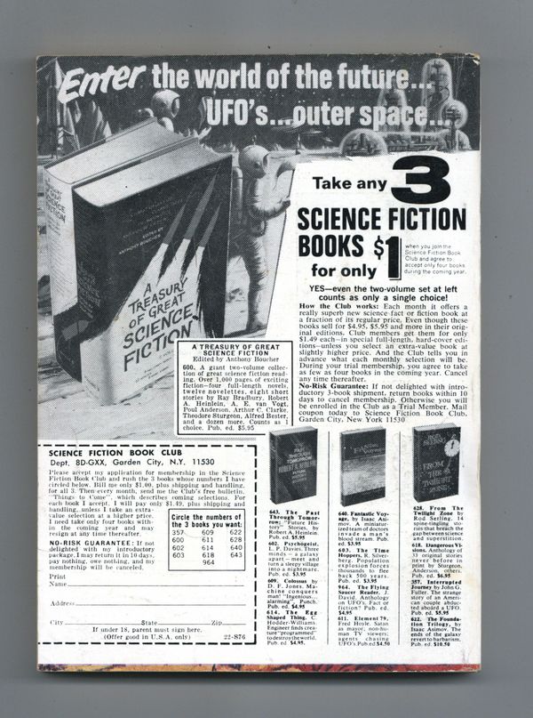 December 1968. Cover by John Pederson. Stories: "The Sharing of Flesh" by Poul Anderson, "Subway To The Stars" by Raymond F. Jones, "A Life Postponed" by John Wyndham, "Spying Season" by Mack Reynolds, "One Station of the Way" by Fritz Leiber, "Sweet Dreams, Melissa" by Stephen Goldin, "Jinn" by Joseph Green. Illustrations by Reese, Jack Gaughan, Gray Morrow, and Roger Brand. Softcover Pulp Digest, 5-in. x 7-in.;194 Pages, B&W. Cover price $0.60.