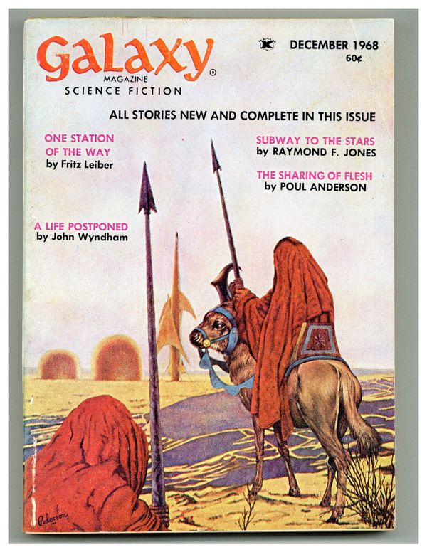 Published Dec 1968 by Galaxy Publications.$4.00December 1968. Cover by John Pederson. Stories: "The Sharing of Flesh" by Poul Anderson, "Subway To The Stars" by Raymond F. Jones, "A Life Postponed" by John Wyndham, "Spying Season" by Mack Reynolds, "One Station of the Way" by Fritz Leiber, "Sweet Dreams, Melissa" by Stephen Goldin, "Jinn" by Joseph Green. Illustrations by Reese, Jack Gaughan, Gray Morrow, and Roger Brand. Softcover Pulp Digest, 5-in. x 7-in.;194 Pages, B&W. Cover price $0.60.