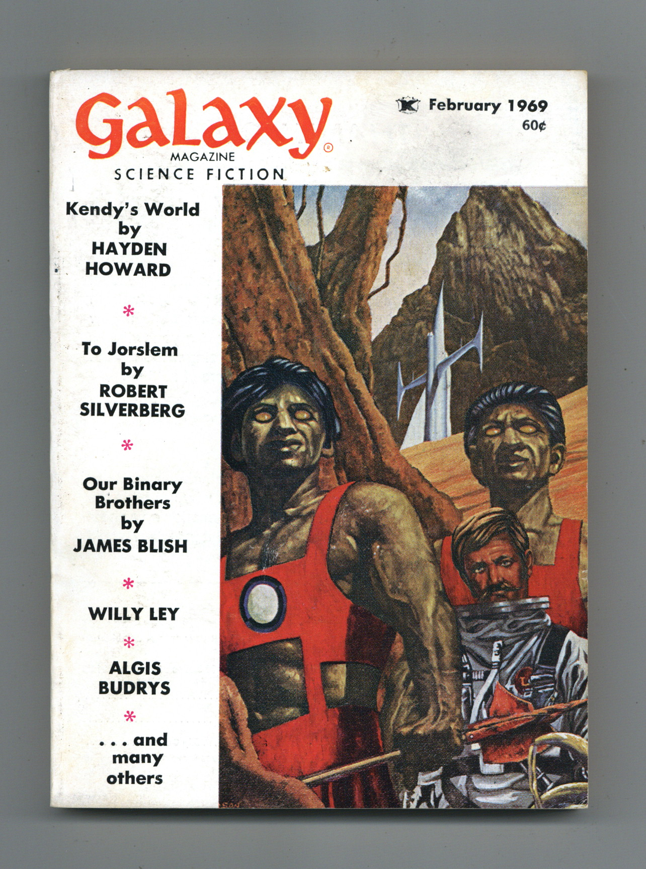 Published Feb 1969 by Galaxy Publications.$15.75February 1969. Cover by John Pederson. Stories: "To Jorslem" by Robert Silverberg, "Golden Quicksand" by J.R. Klugh, "Kendy's World" by Hayden Howard, "Now Hear The Word of the Lord" by Algis Budrys, "The War With The Fnools" by Philip K. Dick, and "Our Binary Brothers" by James Blish. Illustrations by Jack Gaughan, Bruce Jones, Brock, and Reese. Softcover Pulp Digest, 5-in. x 7-in.;194 Pages, B&W. Cover price $0.60.