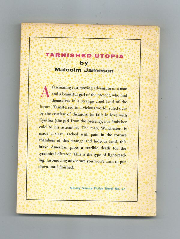Published 1956 (est.) by Galaxy Publishing.$13.00Volume 27 - 1st printing. "Tarnished Utopia" Written by Malcolm Jameson. Softcover, 5 1/2-in. x 7 1/2-in., 128 pages, text only. Cover price $0.35.