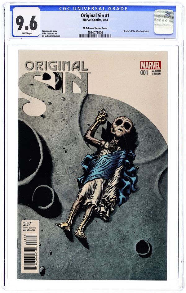 Limited 1 for 25 Retailer Incentive Variant Cover by Ed McGuinness. Written by Jason Aaron. Art by Mike Deodato. WHO SHOT THE WATCHER? The Watcher, the mysterious space-god who's been watching us from the moon for as long as we can remember... is dead. Thus begins the greatest murder mystery in Marvel Comics history. As Nick Fury leads the heroes of the Marvel Universe in an investigation, other forces are marshaling as well and other questions are arising. Why is Black Panther gathering a secret team of his own, including Emma Frost, the Punisher and Dr. Strange? Who is the Unseen? What was the Original Sin? What was stolen from the Watcher's lair? And most importantly, who now holds the Marvel Universe's darkest secrets in the palm of their hand? 44 pages, full color. Cover price $4.99.