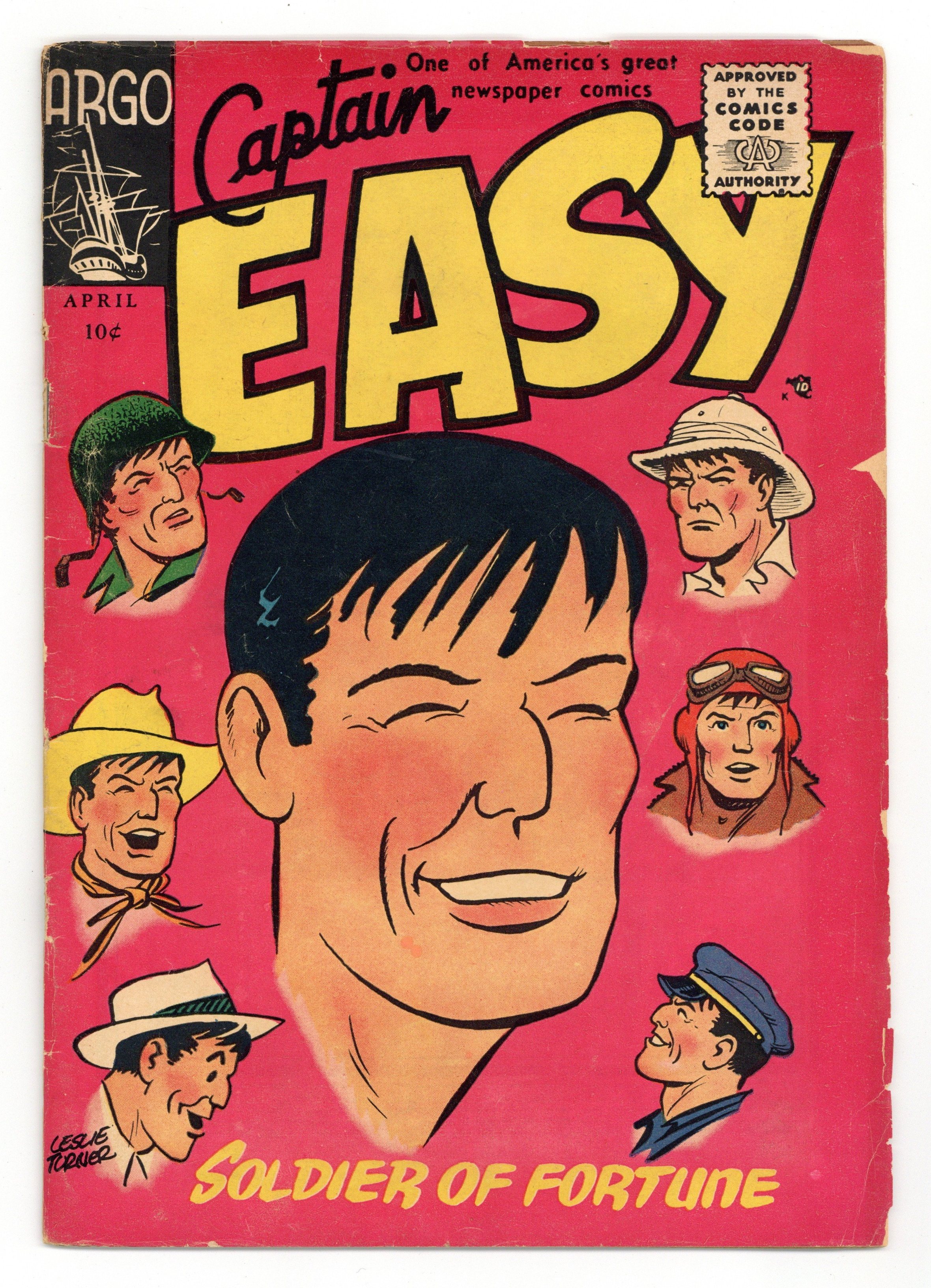 Cover by Leslie Turner. Stories and art by Leslie Turner and William Ferguson. Argo reprints the classic comic strip created by Roy Crane, featuring adventures of the vagabond adventurer during the Leslie Turner era. After the war, Easy becomes a private detective, and Doris Frayne is being blackmailed. On a fishing vacation, Easy overhears another detective checking into Doris's past, and decides to get involved after he meets Doris's young son Bobby. Plus the Ripley-like This Curious World. Captain Easy; Righterong; The Desperate Men; This Curious World. 32 pages, Full Color. Cover price $0.10.