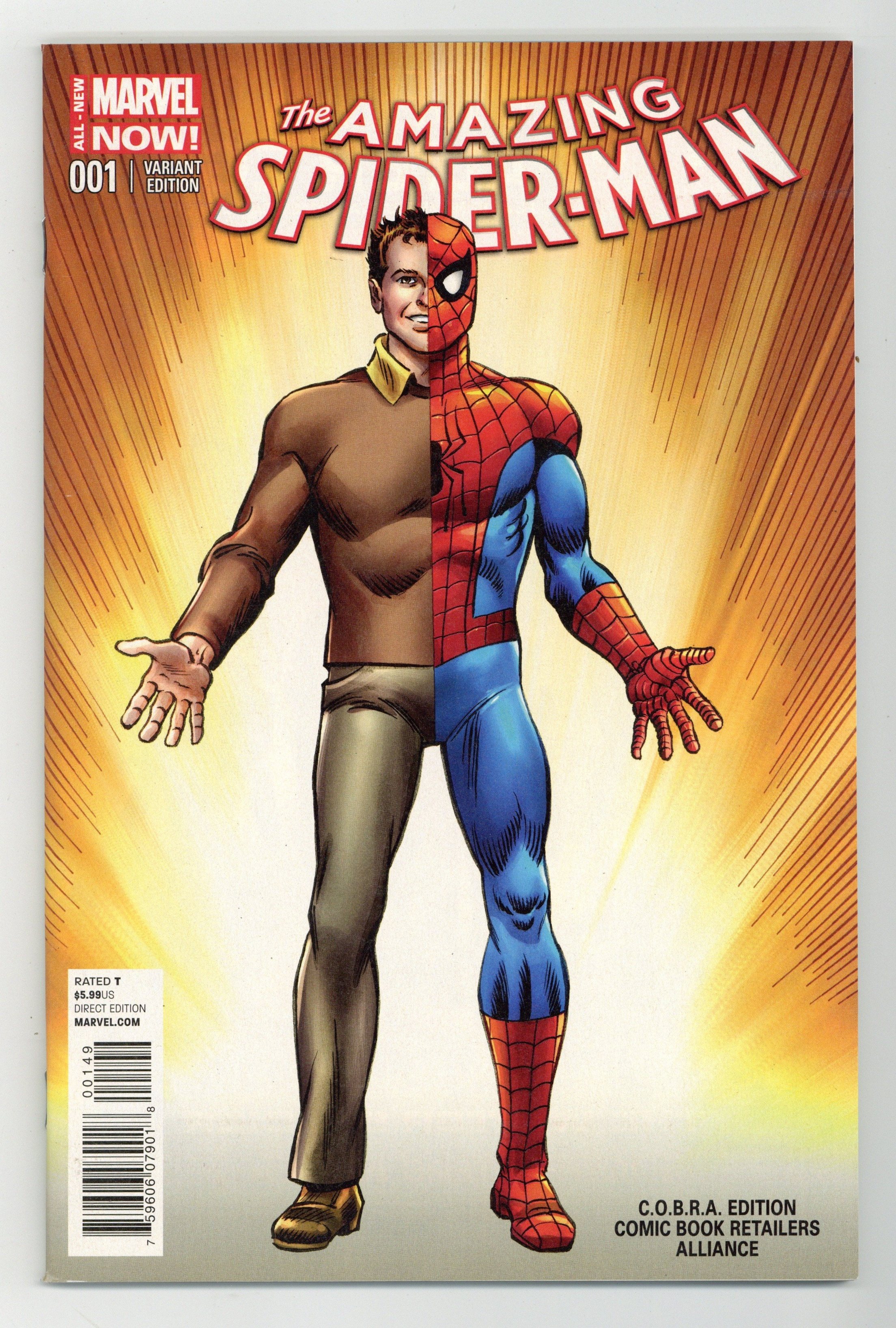Cobra Edition Comic Book Retailers Alliance Variant Cover by John Romita Sr. Written by Dan Slott, Christos Gage, Christopher Yost, Joe Caramagna and Peter David. Art by Humberto Ramos, Javier Rodriguez, Will Sliney, Giuseppe Camuncoli, Chris Eliopoulos, David Baldeon, Ramon Perez and Victor Olazaba. The Greatest Super Hero of All Time RETURNS! The world may have changed since Spidey's been gone, but so has Peter Parker. This is a man with a second chance at life, and he's not wasting a moment of it. Same Parker Luck, new Parker attitude. Putting the 'friendly' back in the neighborhood, the 'hero' back into 'super hero,' and the 'amazing' back into 'Spider-Man!' Also returning: The recharged and reenergized ELECTRO! 96 pages, full color.