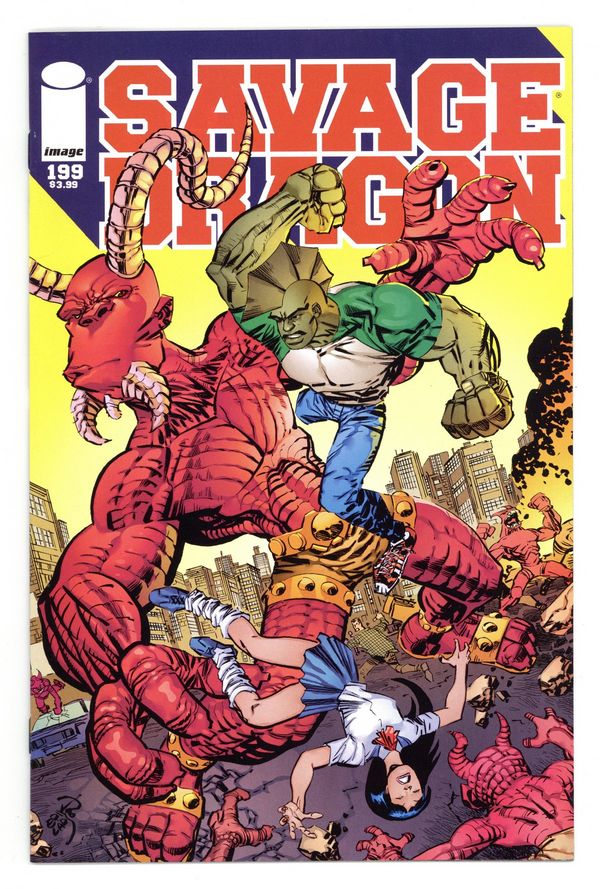 Story, Art and Cover by Erik Larsen. COUNTDOWN TO ISSUE #200 REACHES ITS PENULTIMATE ISSUE! Malcolm Dragon tackles the deadly Demonoids! It's an all-out underworld war as the Lava Lords, Ant-Menaces, and Demonoids battle it out for world domination-and whoever wins-we lose!! The surface world is on fire and the son of the Savage Dragon is in over his head! 32 pages, full color. Rated T+ Cover price $3.99.