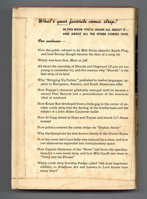 Tags: Comic History$100.001st printing - 1947. Written by Coulton Waugh. The first comprehensive history and analysis of comic strips. Shows the evolution and subgenres of comics from The Yellow Kid in 1895 through the first decade of the modern comic book in the 1940s and considered to be one of the best books ever written on the subject. Profusely illustrated. Hardcover with dust jacket, 6-in. x 9 1/2-in., 360 pages, PC/PB&W. Cover price $5.00.