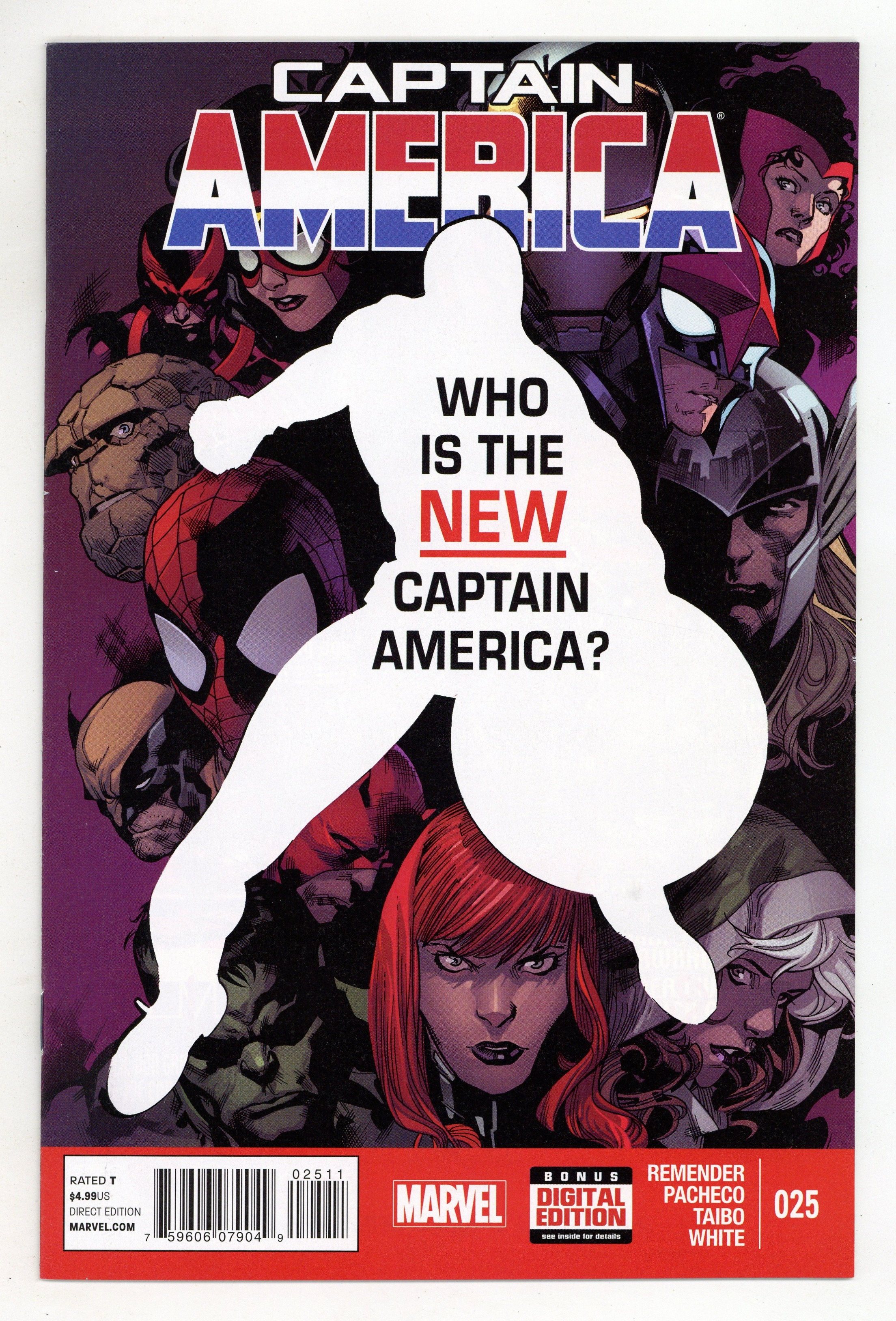 Written by Rick Remender. Art by Carlos Pacheco and Stuart Immonen. Cover by Stuart Immonen. Extra-Sized Issue! Who is the All-New Captain America? The conclusion to the story that began in Dimension Z as Zola strikes in unison with The Red Skull! The final fate of Jet Black! Cover price $4.99.