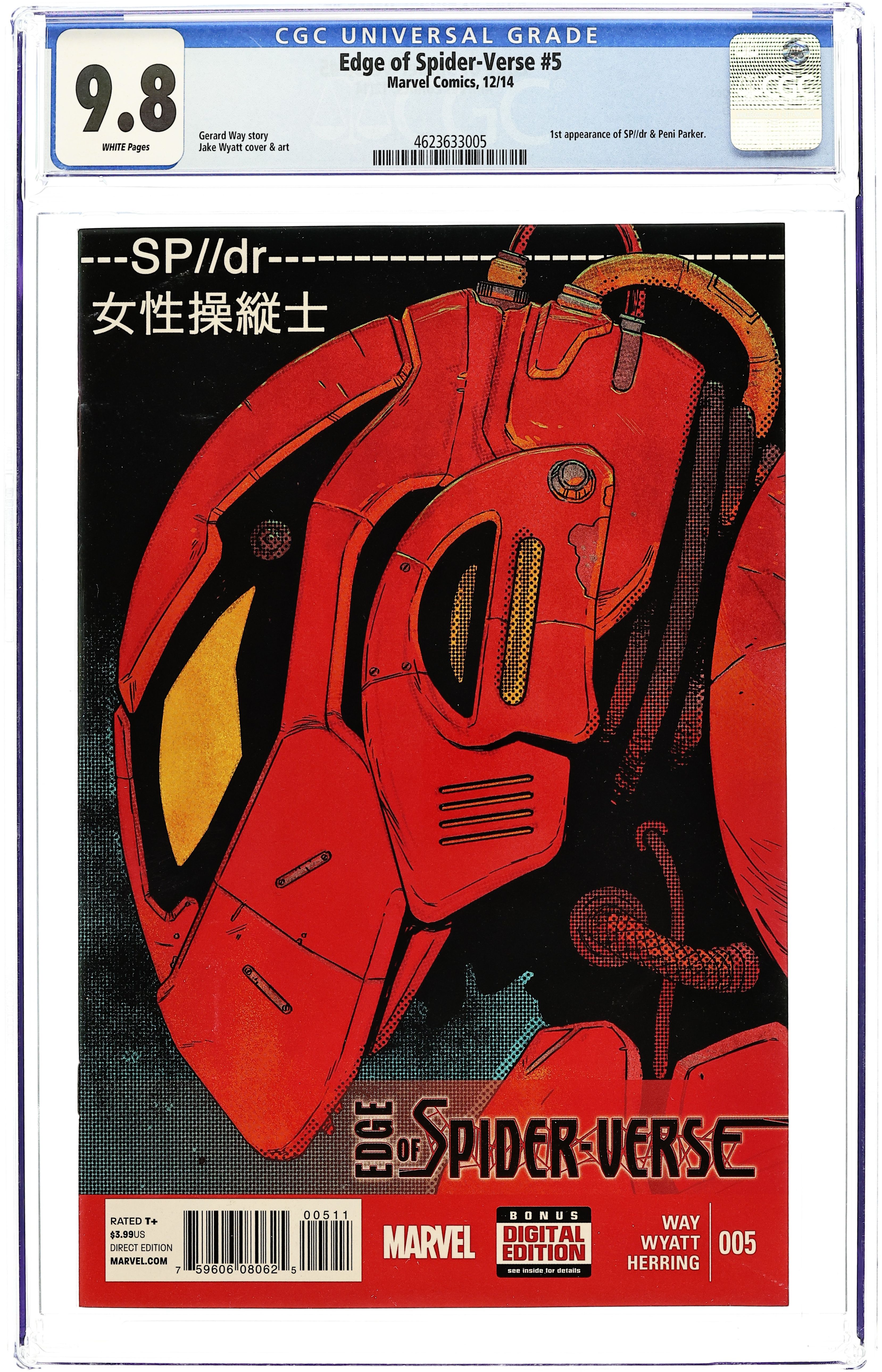 Edge of Spider-Verse: Part 8 of 10 - Written by Gerard Way. Art and Cover by Jake Wyatt. What or who is SP//dr? • Gerard Way (Umbrella Academy) makes his Marvel debut with Jake Wyatt (Ms. Marvel, Indestructible Hulk) establishing a new universe and the incredible Spider character who inhabits it! 28 pages, full color. Rated T+ Cover price $3.99.