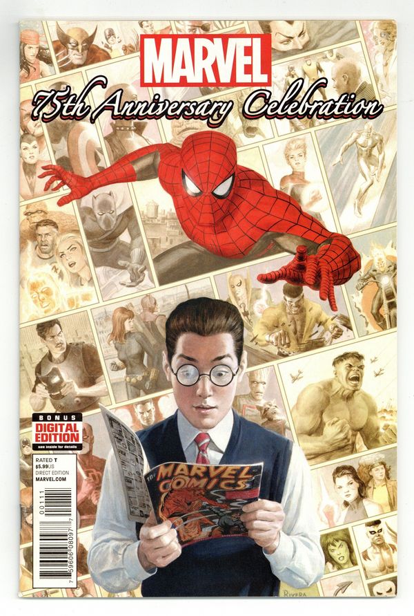 Written by Brian Michael Bendis, Bruce Timm, James Robinson, Len Wein, and Tom Defalco. Art by Alan Davis, Bill Sienkiewicz, Bruce Timm, Chris Samnee, Joe Quinones, Kevin Maguire, Maris C. Wicks, Michael Gaydos, Mike Deodato, Paul Gulacy, Sara Pichelli, Stan Goldberg and Francesco Francavilla. Cover by Paolo Rivera. A super-sized celebration of 75 years of the World's Greatest Comics! What happened the day the Marvel Universe was born? James Robinson and Chris Samnee have the answer! Legendary artist Bruce Timm adapts the very first Captain America story Stan Lee ever wrote, from 1941! As Spider-Man battles the Kingpin, Peter Parker's pals -n- gals lament his absence, in a story by Tom DeFalco and Stan Goldberg. Brian Michael Bendis & Michael Gaydos guide Netflix's Jessica Jones as she investigates a case with roots in the past of the Marvel Universe! Wolverine's 'father' Len Wein and Paul Gulacy recount an untold encounter between Logan and Sabretooth! And More! 60 pages, full color. Rated T Cover price $5.99.