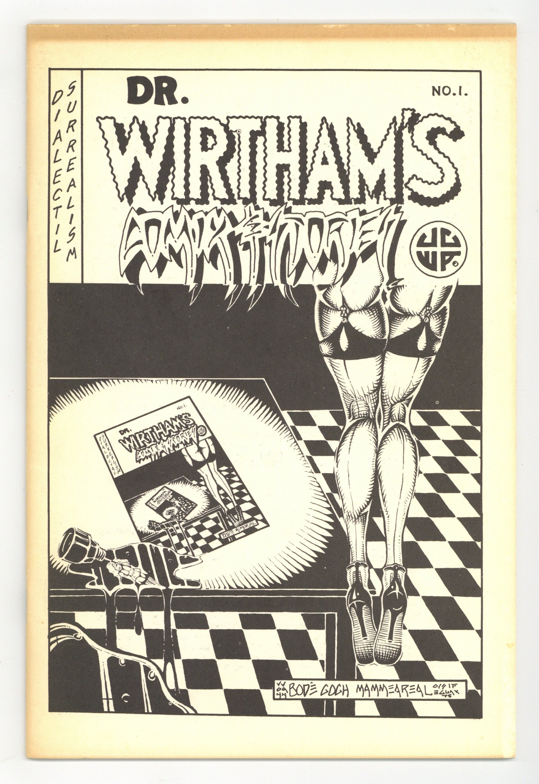 Story, Art, and Cover by Clifford Neal. The first issue of Dr. Wirtham's Comix & Stories was written and illustrated entirely by publisher Clifford Neal, who adopted the pseudonym Oisif Egaux throughout this book (and for most of his other comic book appearances). Much of Neal's art, particularly in this comic, has a distinctive, heavy cross-hatch style. Perhaps this style is derived from Neal's fascination with binary systems analysis (essentially, computer programming, but Neal's interpretation appears to apply to art and human perception). His text article "Decoding The Codex" may help explain his fascination, but I find it essentially incomprehensible. In any case, the artwork is oddly striking and dynamic. 6 1/2-in. x 9-in., 36 pages, B&W. MATURE READERS