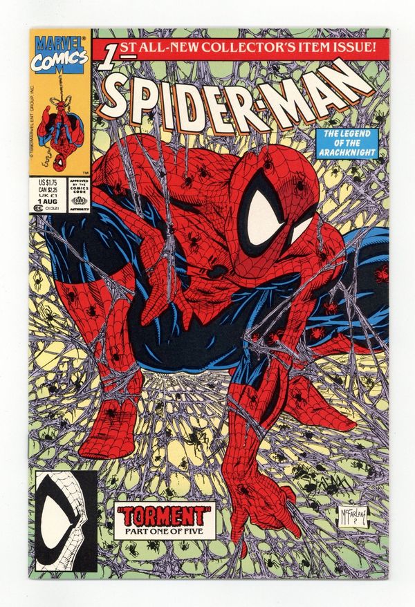 Starts Jan 3 Unbagged Direct Edition - Torment Part 1 of 5. "Torment" Script and art by Todd McFarlane. Cover by Todd McFarlane. Fresh off his legendary run on the Amazing Spider-Man series, superstar artist Todd McFarlane takes the reins of his own Spider-title! Right off the bat the breathtaking action begins as mysterious and ominous drums awaken the Lethal Lizard! And send the reptilian creature on a path of death and destruction thru New York City! Spider-Man's nightmare is just starting! Appearance by Mary Jane Watson. (Notes: Spider-Man #1 was one of the first Marvel issues to feature numerous variant covers. The Spider-Man (1990) series became the fourth monthly title for the web-slinger. This issue was published the same month as Amazing Spider-Man 337. The letters page features an essay by Todd McFarlane. The webbing on the cover may be gray or purple.) 32 pages. Cover price $1.75.