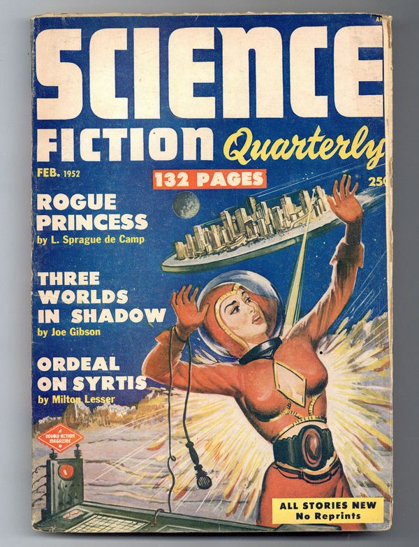 February 1952. Volume 1, Issue 4. Cover by Milton Luros. "Three Worlds in Shadow" by Joe Gibson, "Rogue Princess" by L. Sprague de Camp, "Communicado" by Katherine MacLean, "Ordeal on Syrtis" by Milton Lesser, & "Intervention" by Michael Sherman. Interior illustrations by Milton Luros and Peter Poulton. Softcover pulp magazine; 7-in. x 10-in.; 132 pages; B&W. Cover price $0.25.