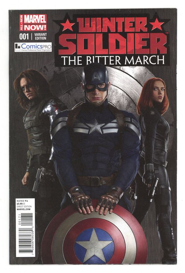 Comics Pro Photo Variant Cover. Written by Rick Remender. Art by Roland Boschi. 1966: With Nick Fury missing, and presumed dead, global espionage agency S.H.I.E.L.D. sends secret agent Ran Shen to collect two Nazi scientists with the key to defining who wins the Cold War. But the Americans are not the only ones who want the high value scientists. The Soviets have opened the Red Room, releasing their most dangerous operative --The Winter Soldier, who unbeknownst to the world, is the presumed-dead partner of Captain America-Bucky Barnes! The brainwashed soldier's mission: to acquire the scientists by any means or to kill them should they fall into American hands. This classic 60's style, high-octane, spy pulp told at Cold War's peak follows Ran Shen and his terrified scientists as they creep out of the shadow of East Berlin. Intrigue, adventure, romance and murder abound with ramifications that will shatter relationships in the modern-day Marvel Universe-including one with the Star Spangled Avenger himself! Cover price $3.99.