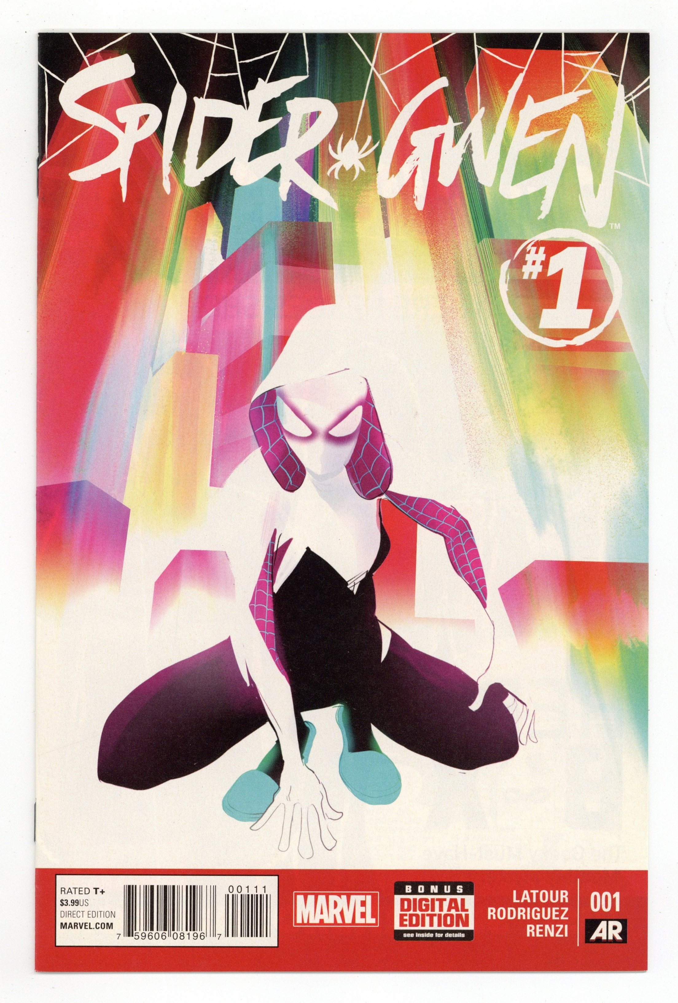 Ends Mar 16 9:24 PM CST Bid History 5 bids Current Bid $36 Your Secret Max Bid If you'd like to bid, please log in or register. Written by Jason Latour. Art and Cover by Javier Rodriguez. SPIDER-GWEN SPINS INTO HER OWN SERIES! BECAUSE YOU DEMANDED IT! The breakout hit of the biggest Spider-Event of the century is taking comic shops by storm this winter with her own new ongoing series - SPIDER-GWEN! Gwen Stacy is Spider-Woman, but you knew that already. What you DON'T know is what friends and foes are waiting for her in the aftermath of Spider-Verse! 28 pages, full color. Rated T+ Cover price $3.99.