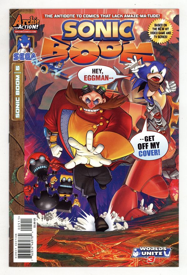 Published Apr 2015 by Archie Publications.$18.00Written by Bill Freiberger. Art by Steven Butler and Matt Herms. Cover by Patrick Spaz Spaziante. Sonic Boom is your antidote to comics that lack amaze-ma-tude! Eggtoberfest! Dr. Eggman's sick and tired of no one trusting him! How on earth can he take advantage of people if they don't trust him to begin with? The answer? Eggtoberfest! Just one small problem: the mechanical master forgot to hire ride operators for his carnivorous carnival creation! So it's Sonic to the rescue! If a good guy helps a bad guy, is that 'helping' at all? 32 pages, full color. Cover price $3.99.