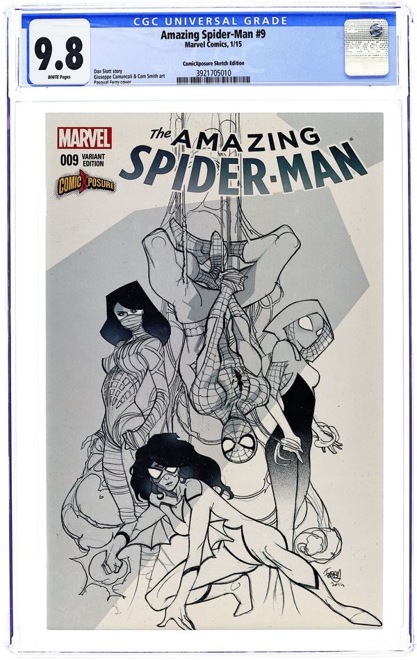 Comicxposure Sketch Variant Cover by Pasquale Ferry. Written by Dan Slott. Art by Olivier Coipel, Giuseppe Camuncoli and Cam Smith. SPIDER-VERSE BEGINS HERE! When a force of evil threatens spider-characters throughout the multiverse, EVERY SPIDER-MAN EVER is needed to save the day! Rated T