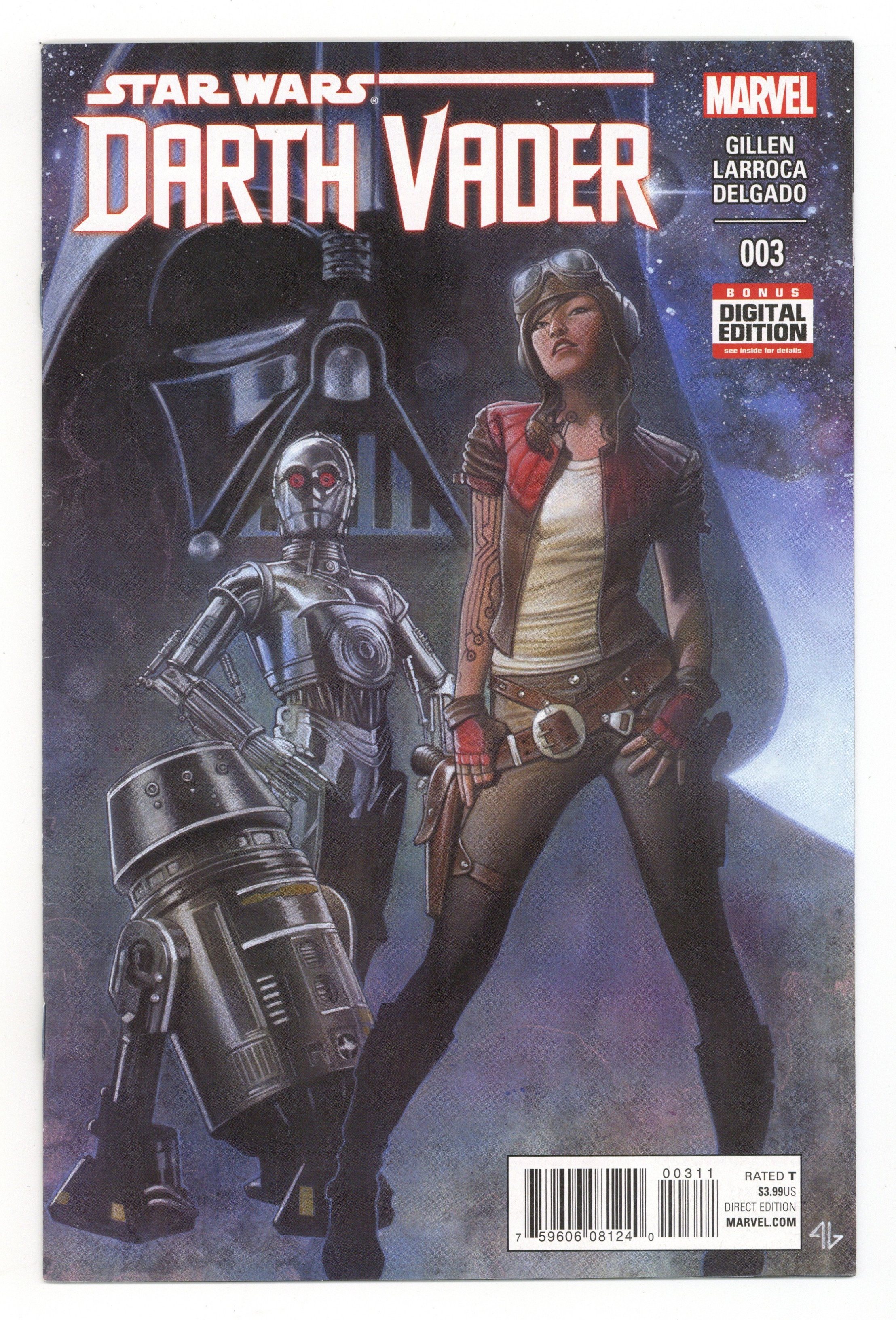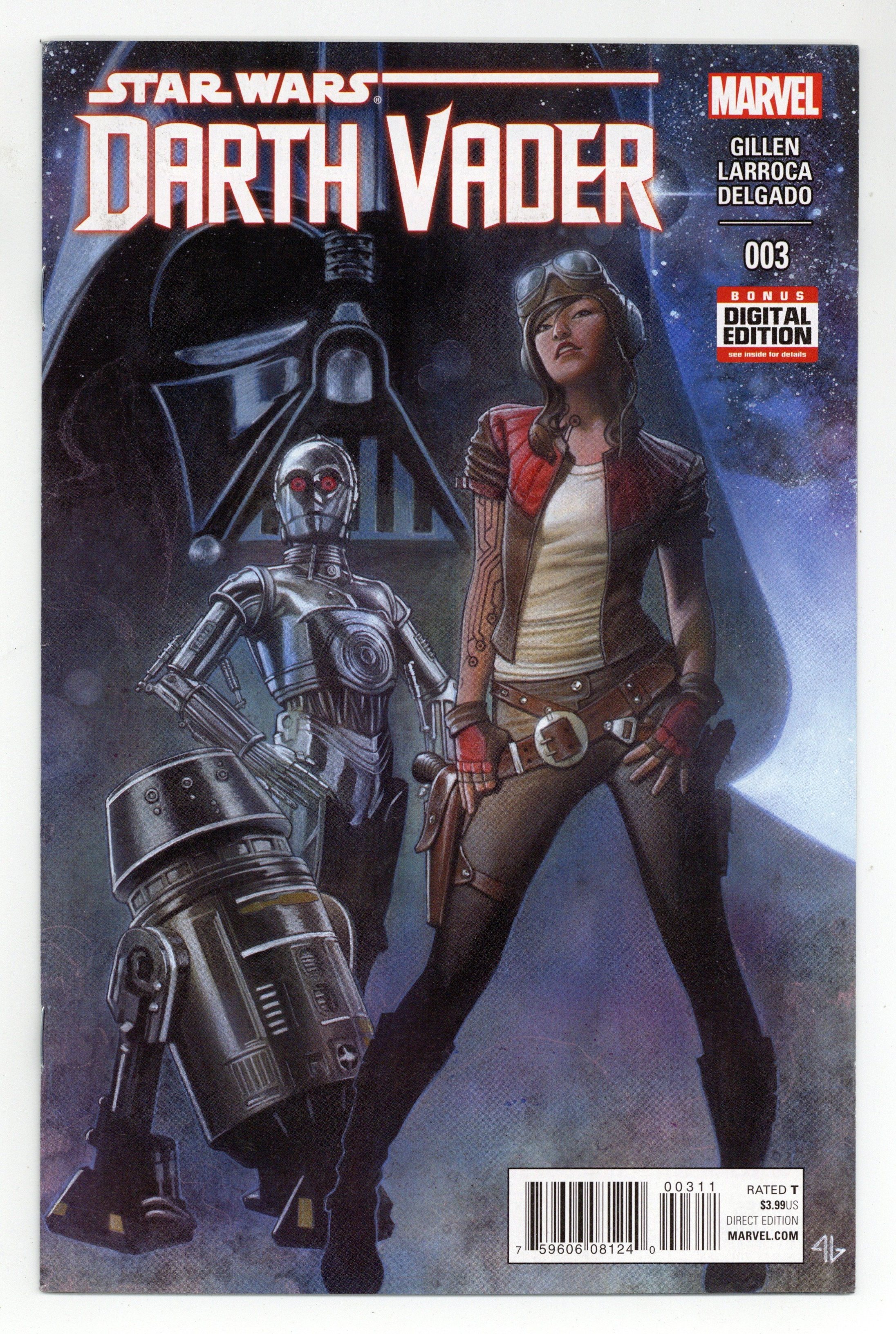 Ends Mar 2 9:24 PM CST Bid History 9 bids Current Bid $70 Your Secret Max Bid If you'd like to bid, please log in or register. Written by Kieron Gillen. Art by Salvador Larroca. Cover by Adi Granov. When a Dark Lord needs help, who can he turn to? Meet Aphra-the galaxy's foremost raider of lost weaponry! Plus: could these be the deadly droids she's looking for? 28 pages, full color. Rated T Cover price $3.99.
