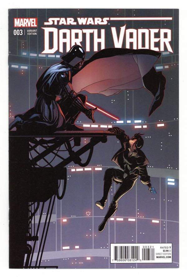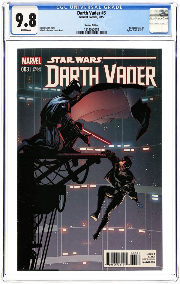 Limited 1 for 25 Retailer Incentive Variant Cover. Written by Kieron Gillen. Art and Cover by Salvador Larroca. When a Dark Lord needs help, who can he turn to? Meet Aphra-the galaxy's foremost raider of lost weaponry! Plus: could these be the deadly droids she's looking for? 28 pages, full color. Rated T Cover price $3.99.