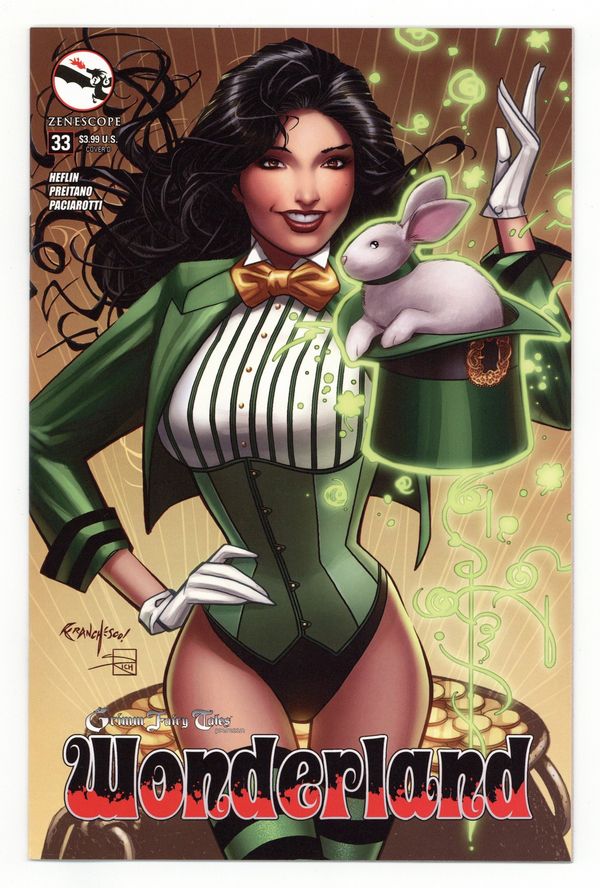 Published Mar 2015 by Zenescope Entertainment.$12.00Written by Erica J Heflin. Art by Manuel Preitano. Cover by Franchesco. LAUNCH POINT! With the White Rabbit uncovering the secrets hidden deep within Wonderland, Calie and Dark Cheshire go on a mountain quest to find the secretive Antipathies. This tri-entity, sickened by the madness that has long infected Wonderland, guards a secret to the Realm's very existence. Elsewhere, a squire to Wonderland's fallen Realm Knights tracks down the Terror and faces his waking nightmares. 32 pages, full color. Cover price $3.99.