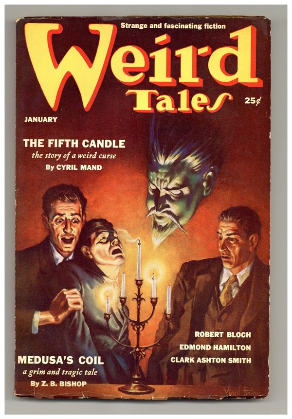 January 1938. Cover and illustrations by Virgil Finlay. Edited by Farnsworth Wright. Stories by Robert Bloch, Edmond Hamilton and Clark Ashton Smith. 6 3/4-in. x 10-in.; black and white; 128 newsprint pages. Cover price $0.25.