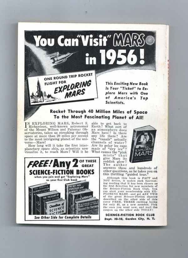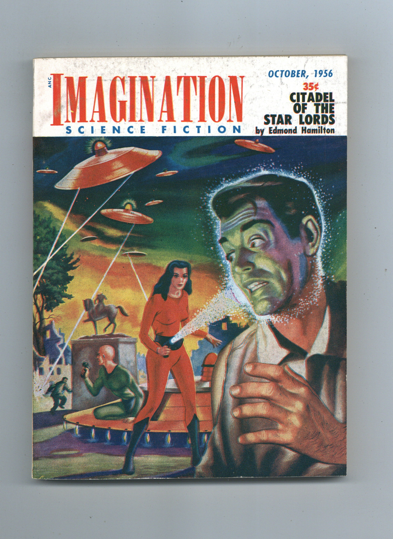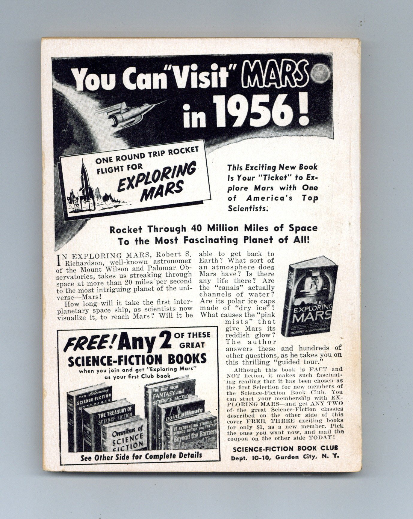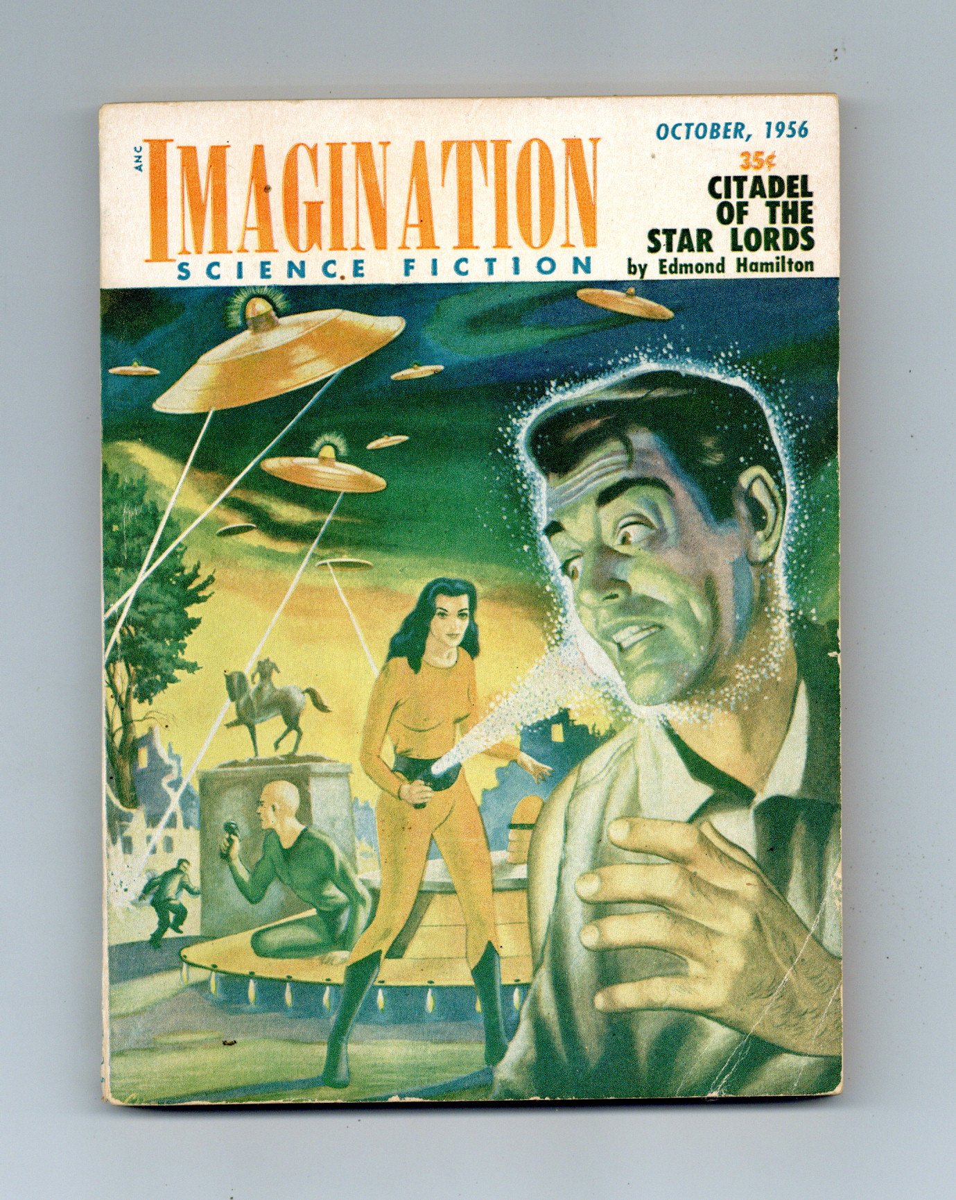 October 1956 "Citadel of the Star Lords" by Edmond Hamilton, and "Trouble on Sun-Side" by S. M. Tenneshaw. 5-3/8 in. x 7-1/4 in; black and white with spot color; 128 pages. Cover price $0.35.