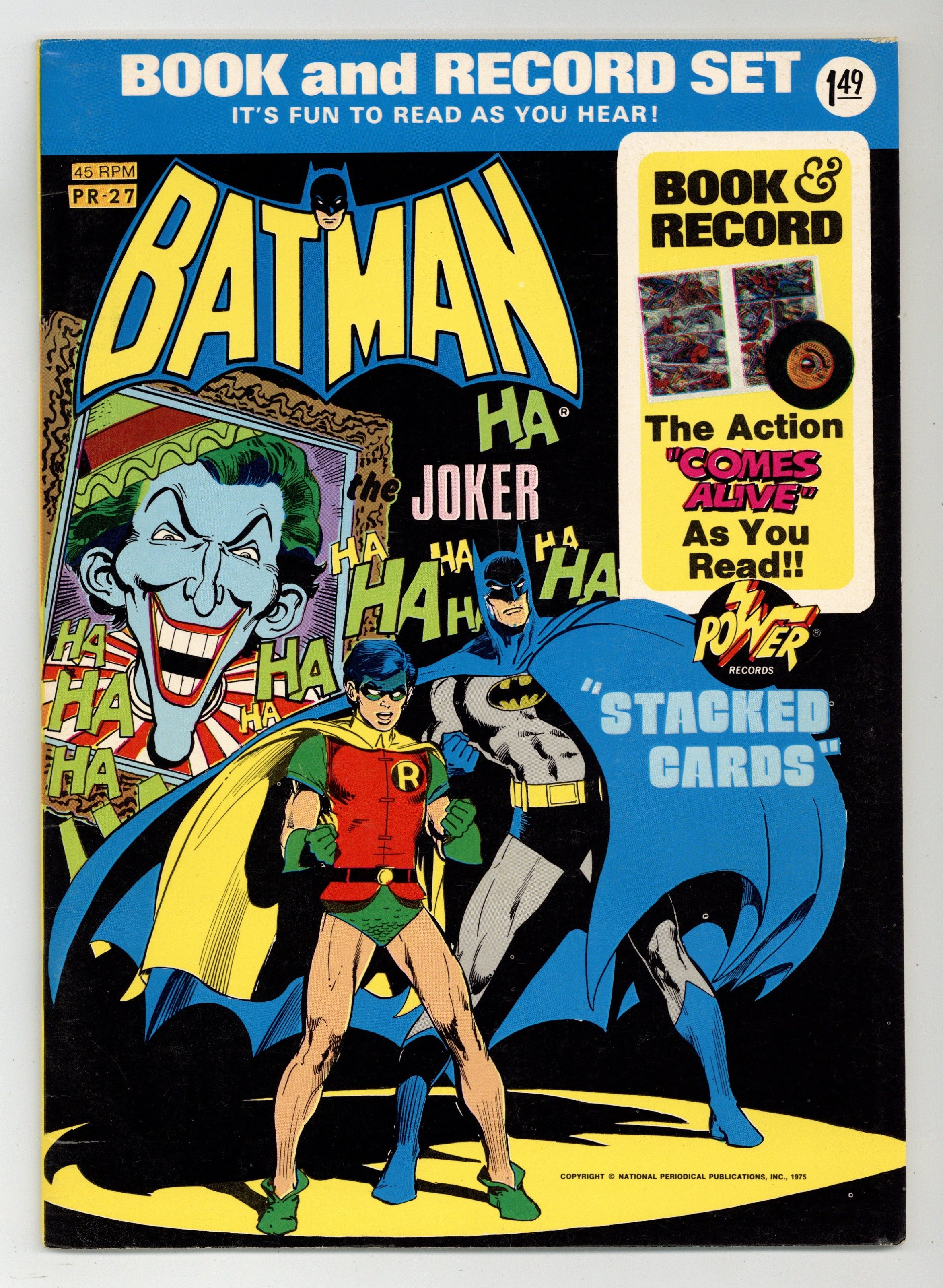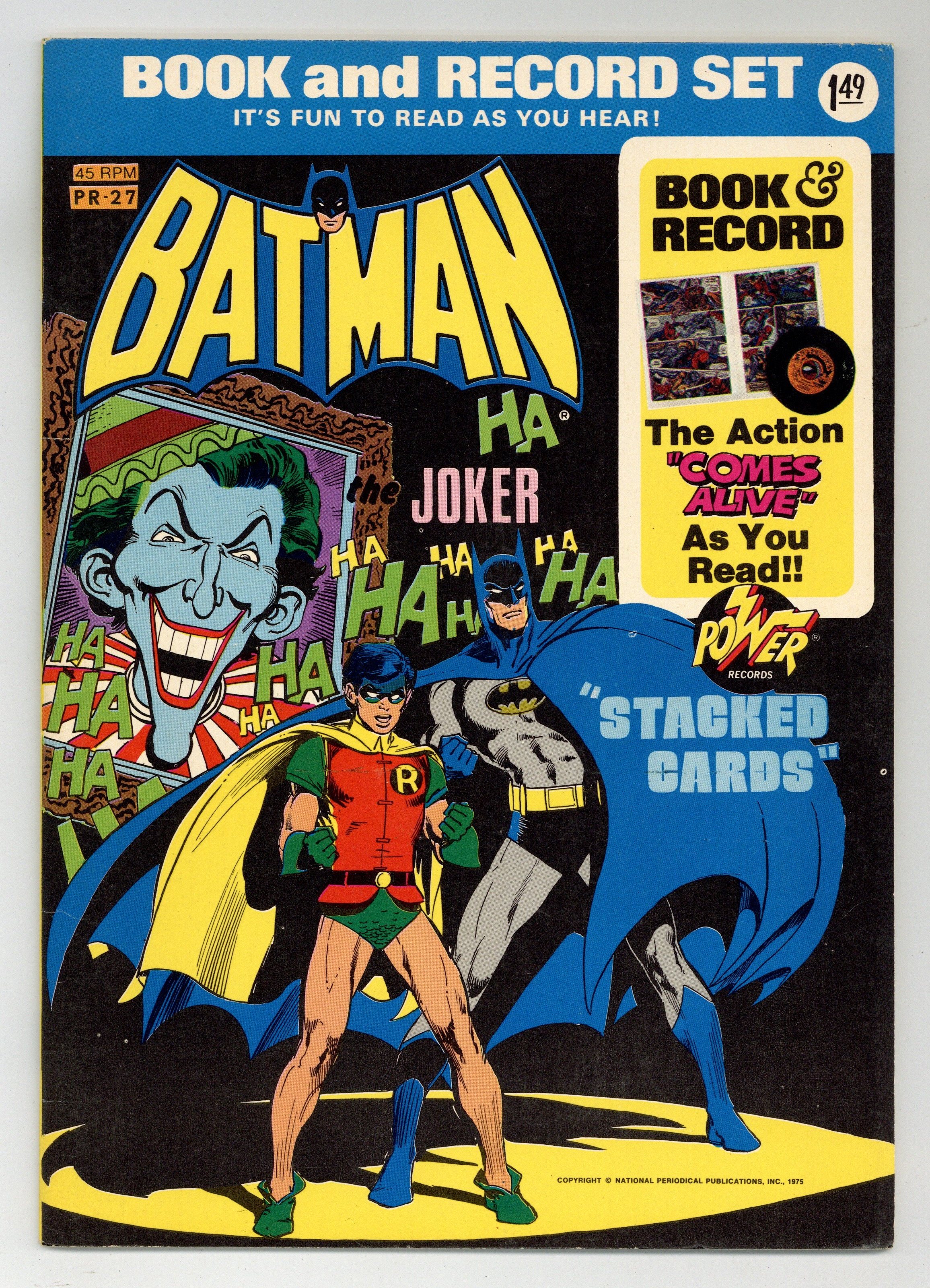 Tags: Power Records Comic/Record Set (part 27AR)Published 1975 by Power Records.$25.001st Power Records Edition with art cover. INCLUDES RECORD. Batman in "Stacked Cards." 20-page full color comic with 45 RPM record. 7-1/8 x 10 inches with cardstock cover and white non-gloss interior paper stock. NOTE: Any copy listed here, regardless of grade assigned, includes both comic and 45 RPM record. Cover price $1.49.