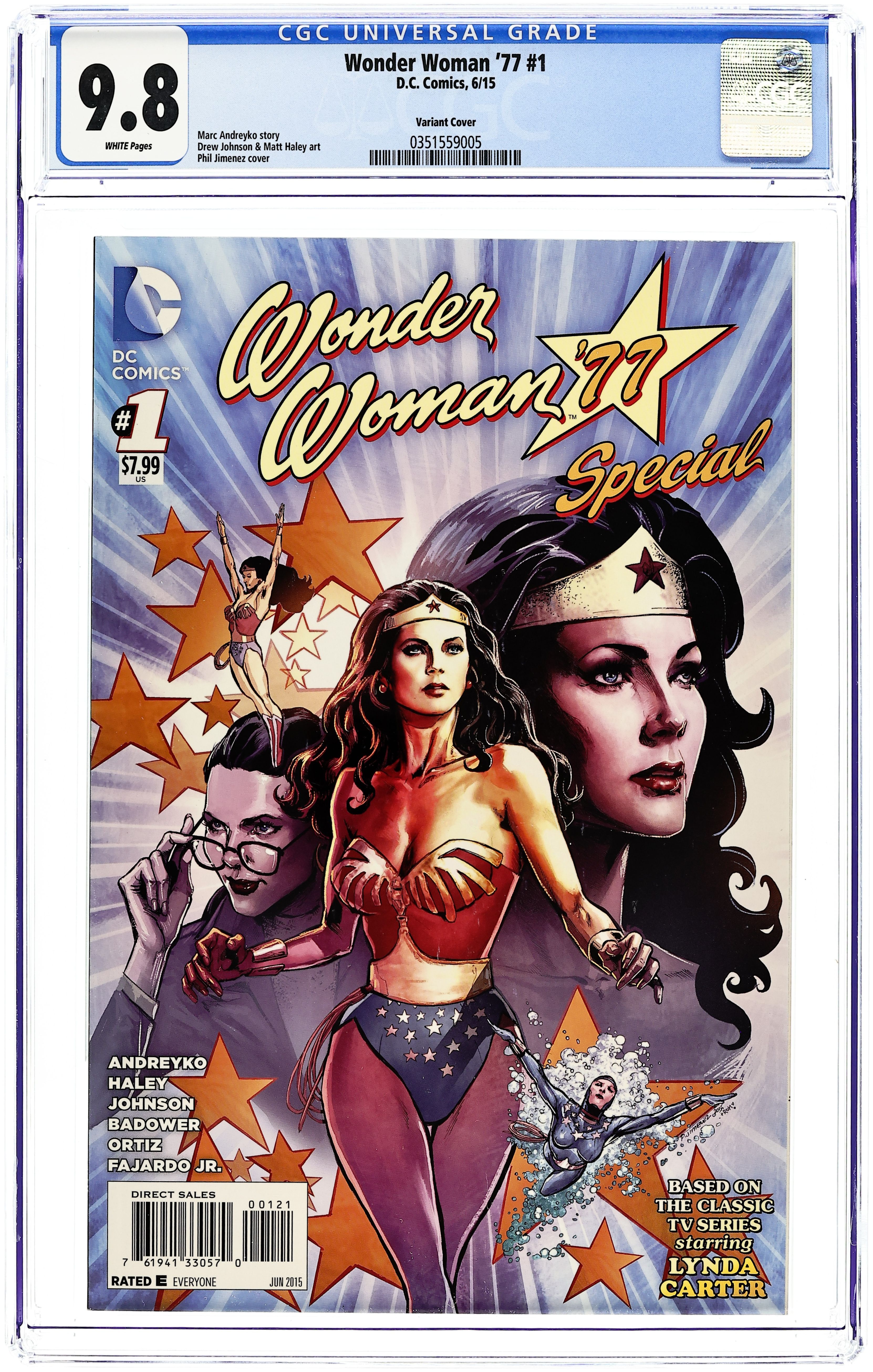 Limited 1 for 25 Retailer Incentive Variant Cover. Written by Marc Andreyko. Art by Drew Johnson, Matt Haley, Jason Badower and Richard Ortiz. Cover by Phil Jimenez. Don't miss this digital-first special based on the classic TV series starring Lynda Carter! Travel back to the sizzling '70s as the undercover Amazon Princess joins forces with special agent Steve Trevor to defend America against Cold War-era criminals. A search for an escaped Soviet scientist brings Wonder Woman to the hottest disco of the day, Studio 52. A live stage act might prove more of a threat to Wonder Woman than the Russian Roller Derby girls out to bring the scientist home. 80 pages, full color. All Ages Cover price $7.99.