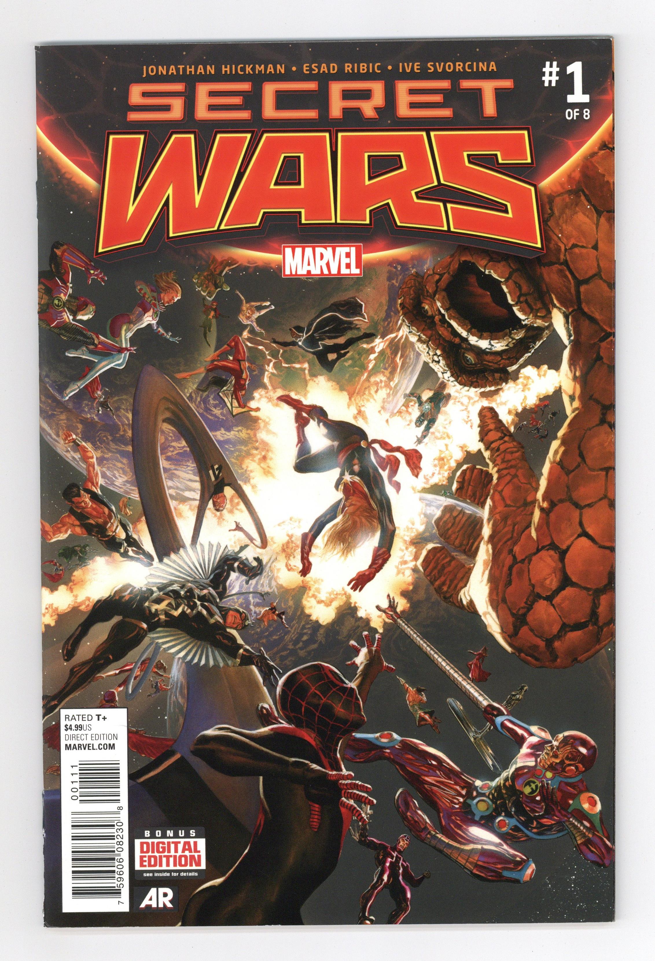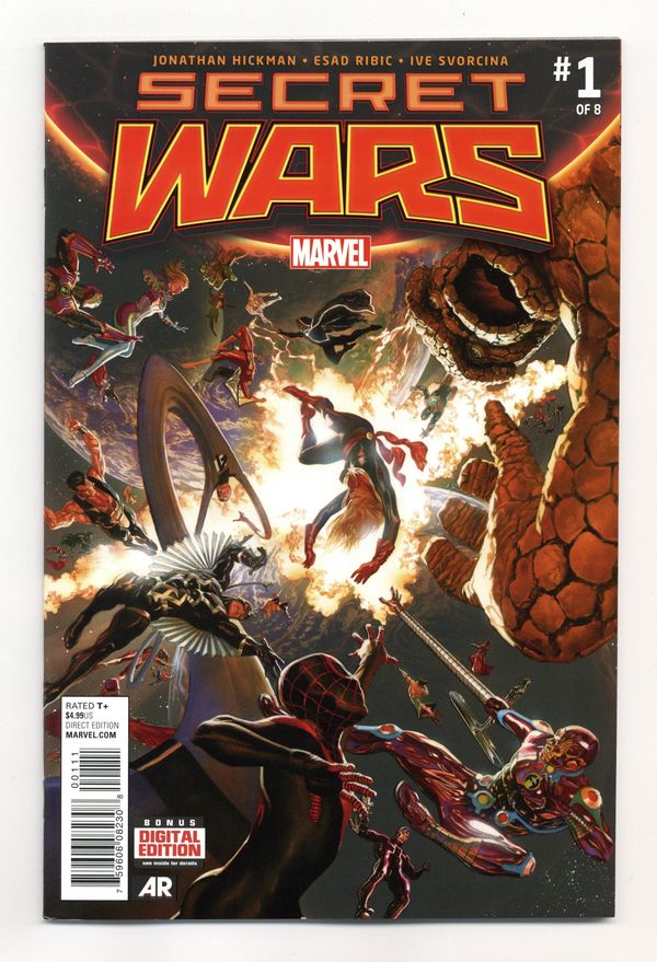 Tags: Secret Wars (2015) (part 1), Avengers, Doctor Doom, Fantastic Four, Guardians of the Galaxy, Hulk, Iron Man, Spider-Man, X-Men$10.50Written by Jonathan Hickman. Art by Esad Ribic. Cover by Alex Ross. THE FINAL INCURSION IS HAPPENING! THE MARVEL UNIVERSE IS COLLIDING WITH THE ULTIMATE UNIVERSE! AND NEITHER WILL SURVIVE! 52 pages, full color. Rated T+ Cover price $4.99.