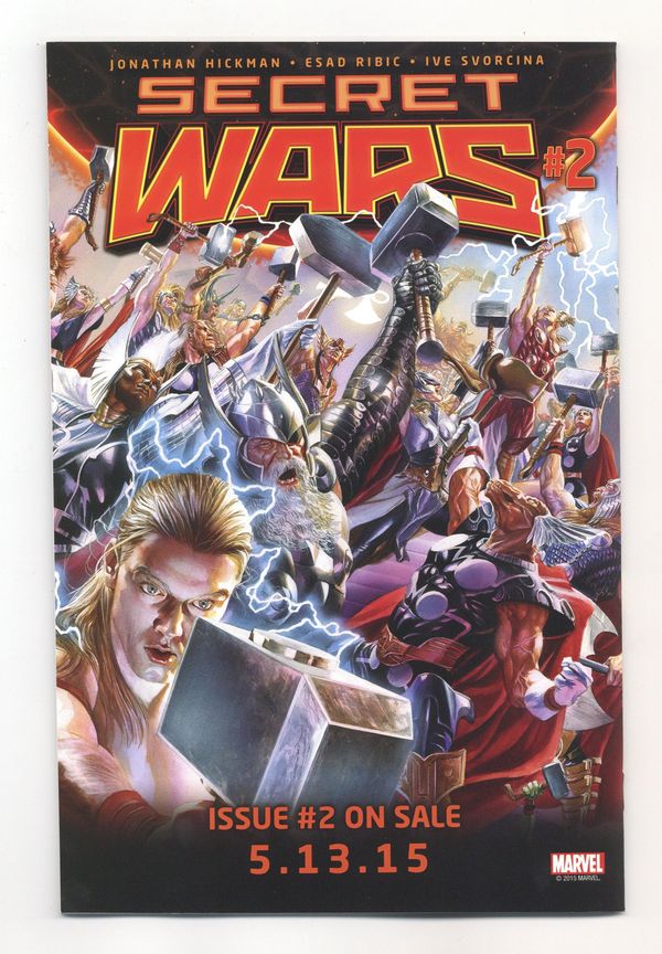Tags: Secret Wars (2015) (part 1), Avengers, Doctor Doom, Fantastic Four, Guardians of the Galaxy, Hulk, Iron Man, Spider-Man, X-Men$24.00Written by Jonathan Hickman. Art by Esad Ribic. Cover by Alex Ross. THE FINAL INCURSION IS HAPPENING! THE MARVEL UNIVERSE IS COLLIDING WITH THE ULTIMATE UNIVERSE! AND NEITHER WILL SURVIVE! 52 pages, full color. Rated T+ Cover price $4.99.