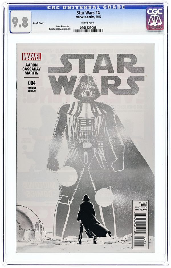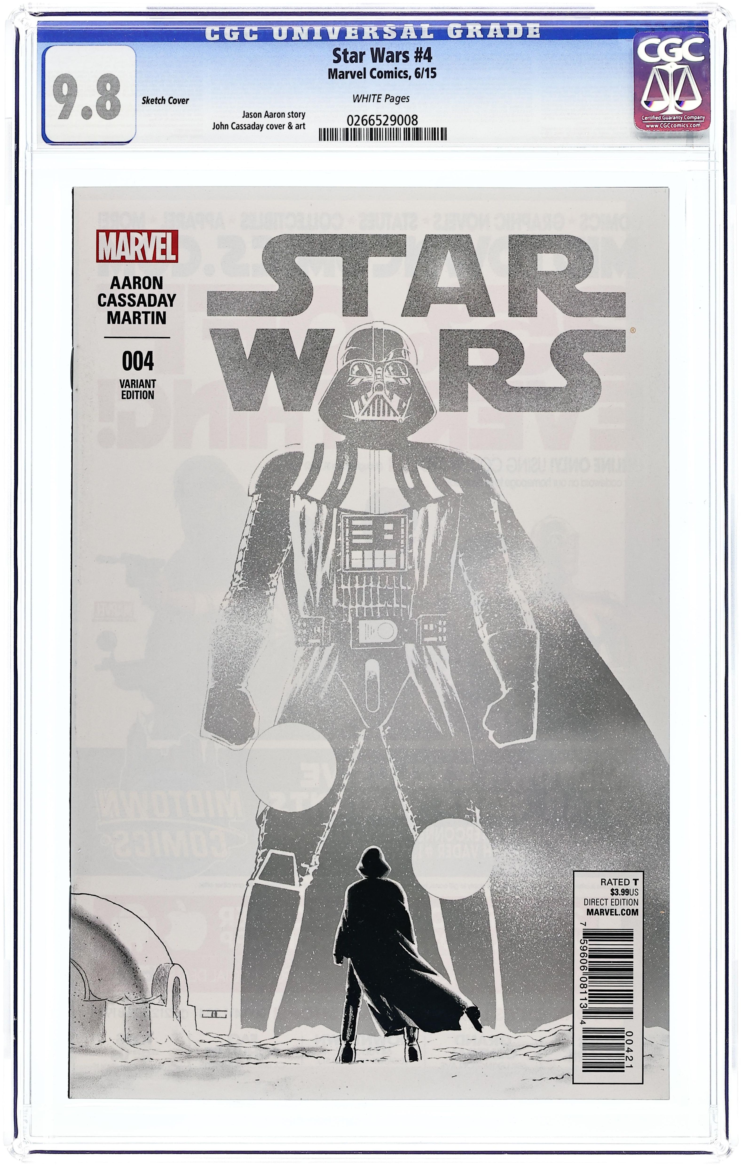 Limited 1 for 100 Retailer Incentive Variant Cover. Written by Jason Aaron. Art and Cover by John Cassaday. THE GREATEST SPACE ADVENTURE OF ALL TIME CONTINUES! Luke Skywalker is NOT a Jedi-not yet, at least. He's only ever met one Jedi in his life...and he died. So, Luke's quest leads him back to Obi-Wan's hut...on Tatooine. 28 pages, full color. Rated T Star Wars Lucasfilm Ltd. & TM. All rights reserved. Used under authorization. Text and illustrations for Star Wars are 2015 Lucasfilm Ltd. Cover price $3.99.