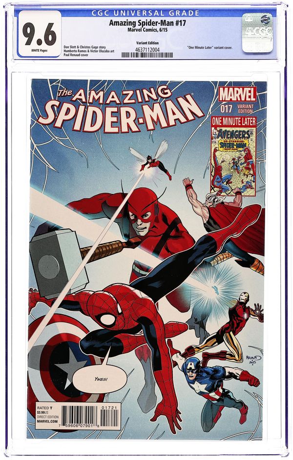 Limited 1 for 15 Retailer Incentive Variant Cover. The Graveyard Shift: Part 2 of 3 - Written by Dan Slott and Christos Gage. Art by Humberto Ramos and Edgar Delgado. Cover by Paul Renaud. The Ghost has invaded Parker Industries! With this super-powered saboteur, no secret is safe-- no PEOPLE are safe, either, for that matter. 36 pages, full color. Rated T Cover price $3.99.