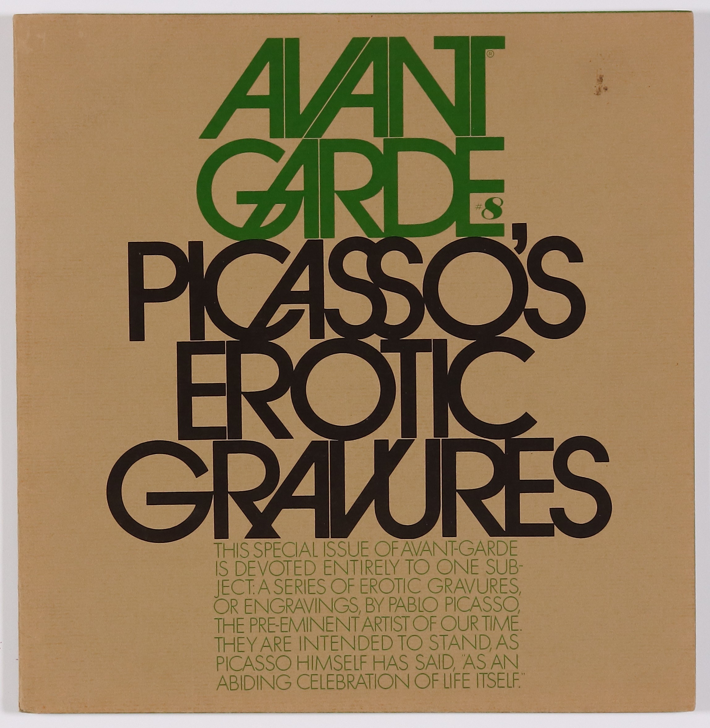 Tags: Art BookPublished Sep 1969 by Avant Garde Media.$20.00Art by Pablo Picasso. Counterculture magazine created and edited by Ralph Ginzberg. Issue features Picasso's erotic gravures. 10 3/4-in. x 11 1/4-in. 60 Pages B&W. Cover price $3.00.