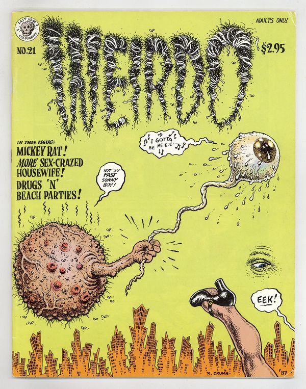 Cover by Robert Crumb. "The Black Cat Bone," script and art by Mary Fleener; How to sacrifice a black cat. Harvey Sez column; Harvey Pekar praises the work of Leonard Rifas and Joyce Brabner's "Real War Stories." "Beach Blanket," script and art by William Clark; Surf teenager Angie wants to experience the wider world. "Sex Crazed Housewife or My Troubles With Men," script and art by Aline Kominsky-Crumb; Aline's late-flourishing attraction to men. Ten illustrations and three comics from early '85 to mid '86 by Robert Crumb. "Suburban Teens on Acid 1969," script and art by Dennis Worden. Untitled story, script and art by Spain Rodriguez; Big Bitch comes across a strange religious town. 44 pgs., B&W. 8-in. x 11-in. $2.95. Cover price $2.95.