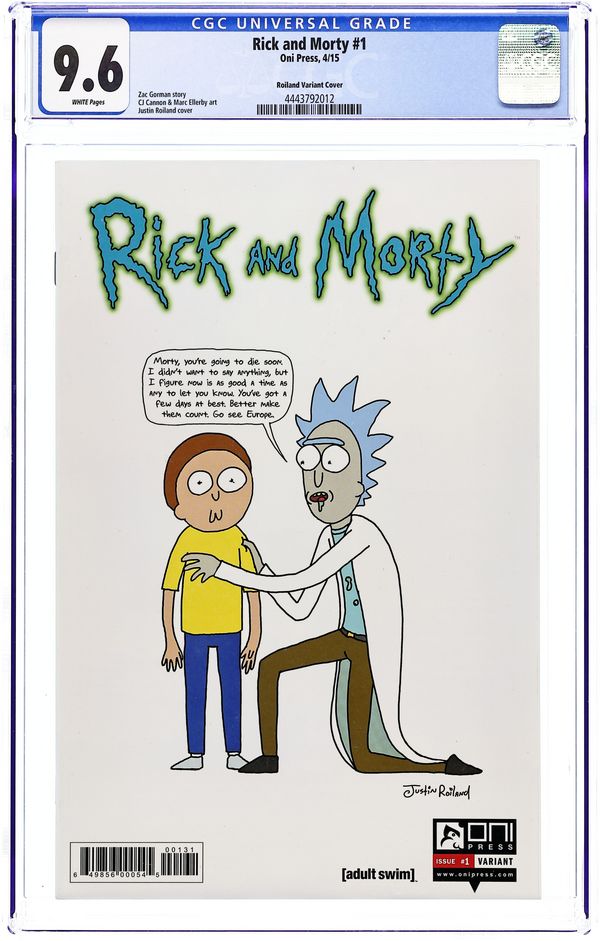 Limited 1 for 50 Retailer Incentive Variant Cover. Written by Zac Gorman. Art by CJ Cannon. Cover by Justin Roiland. Join degenerate superscientist Rick Sanchez as he embarks on all-new insane adventures with his awkward grandson Morty, his teenage granddaughter Summer, his veterinary surgeon daughter Beth, and his hapless son-in-law Jerry. In this issue: Part One of 'The Wubba Lubba Dub Dub of Wall Street'! 32 pages, full color. Cover price $3.99.