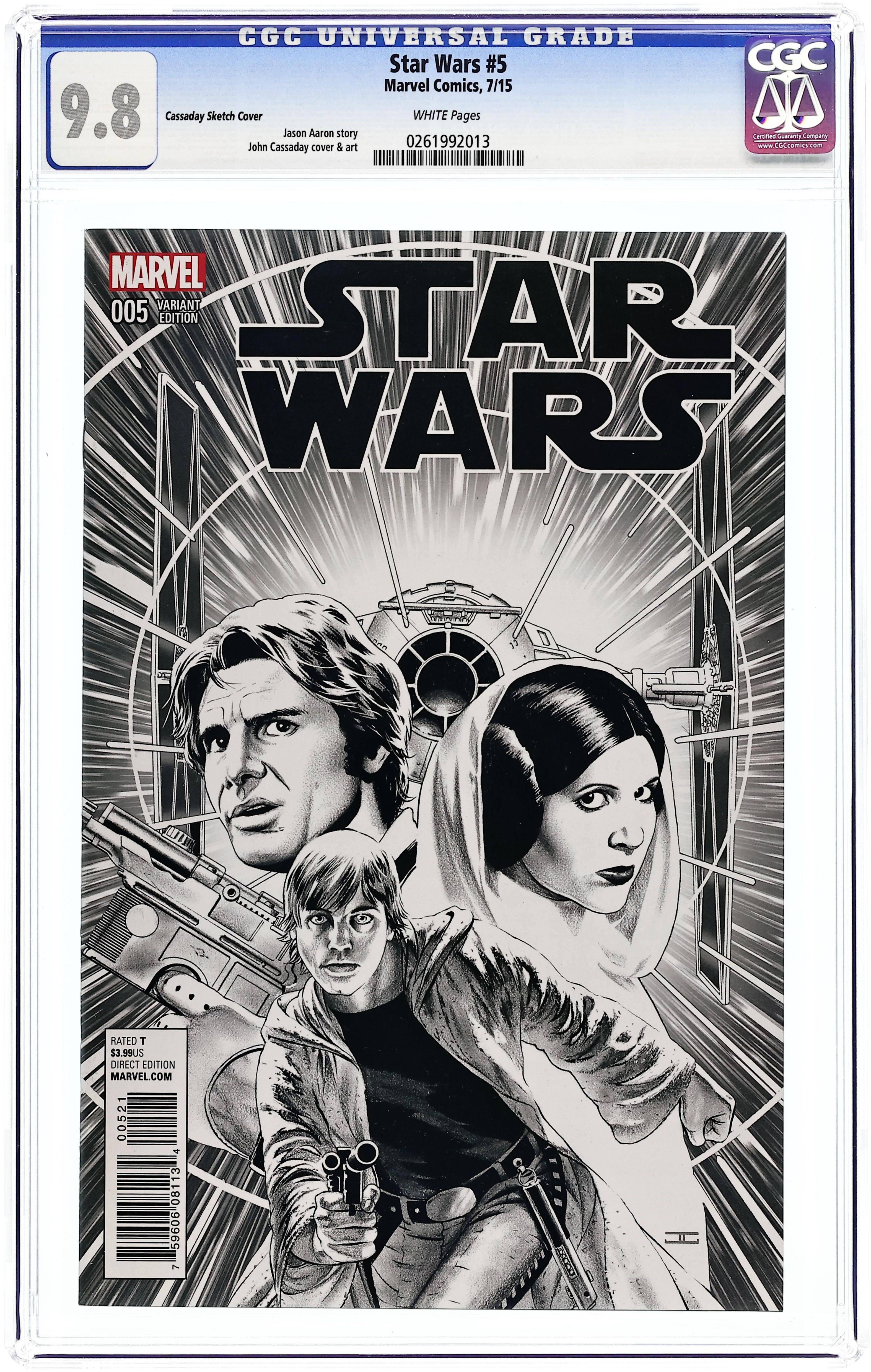 Limited 1 for 100 Retailer Incentive Variant Cover. Written by Jason Aaron. Art and Cover by John Cassaday. THE GREATEST SPACE ADVENTURE OF ALL TIME CONTINUES! As Luke goes home in search of the truth about his late mentor... ...Leia takes Han on a secret mission of vital importance to the Rebellion. Unfortunately, they both run into some unfriendly encounters. 28 pages, full color. Rated T Cover price $3.99.
