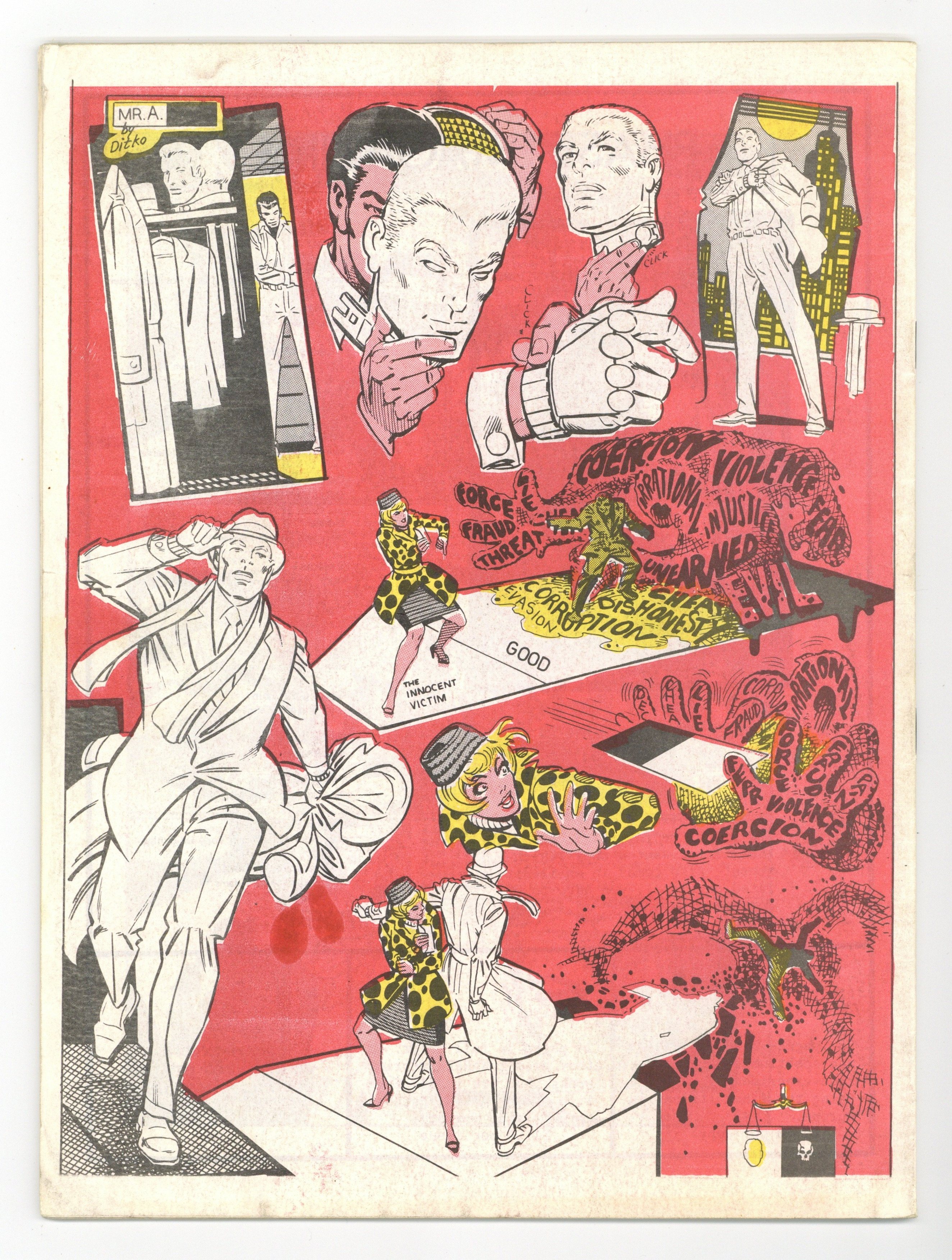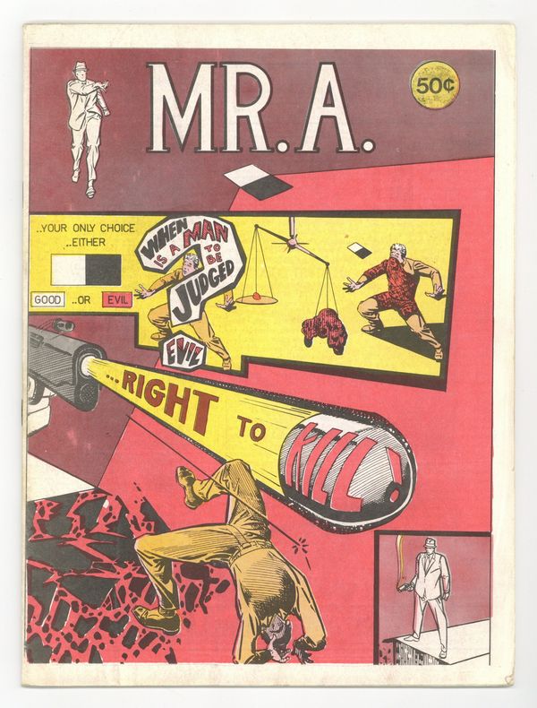 Mr. A is the first in a series of quarterly magazines, each of which was written and drawn entirely by Steve Ditko, without any editorial direction. Somewhat controversial, Mr. A was inspired by Ditko's interest in Ayn Rand's writings. A superhero who espoused an objectivist philosophy, his symbol was a card which was half black and half white representing good and evil, as stated in the comic- "White and Black is Mr. A's symbol of justice: of non-contradictory identification; good is good and evil is evil and neither can be both at the same time. Each is the antithesis of the other! So, if the good is to survive, no compromise with evil is possible!"